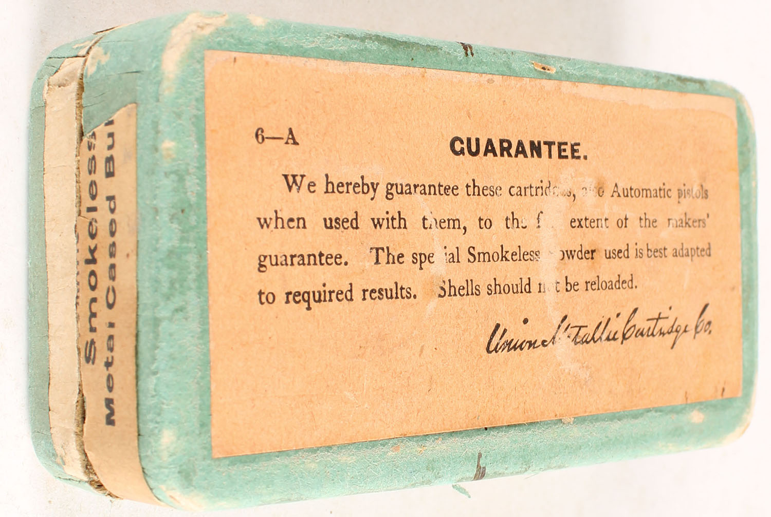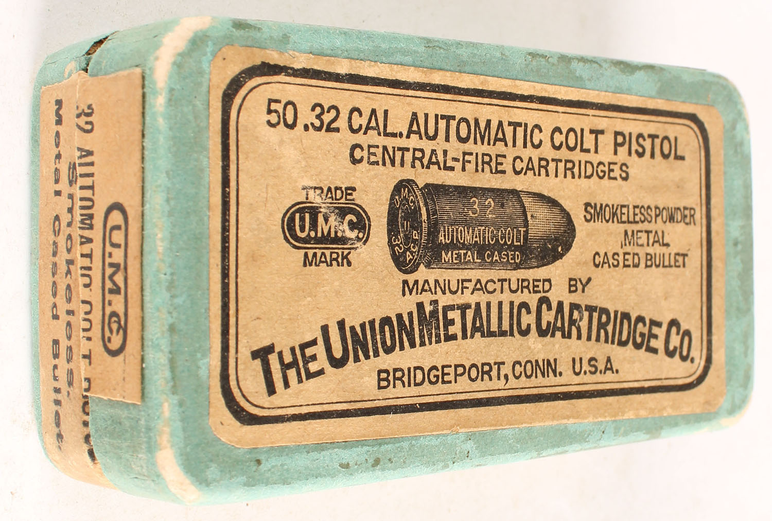 UMC, Central-Fire Cartridges, .32 Automatic Colt, Smokeless Powder, Full, 2pc. Blue box with buff top & side sealing labels, box is solid with excellent color, minor age soiling & corner wear, edges are crisp, side sealing label is 50% intact, ammo is excellent. Grade: Excellent - Value: 16 to 60
