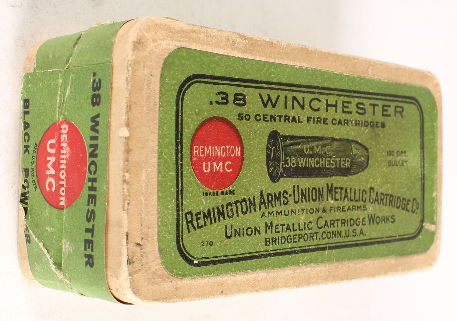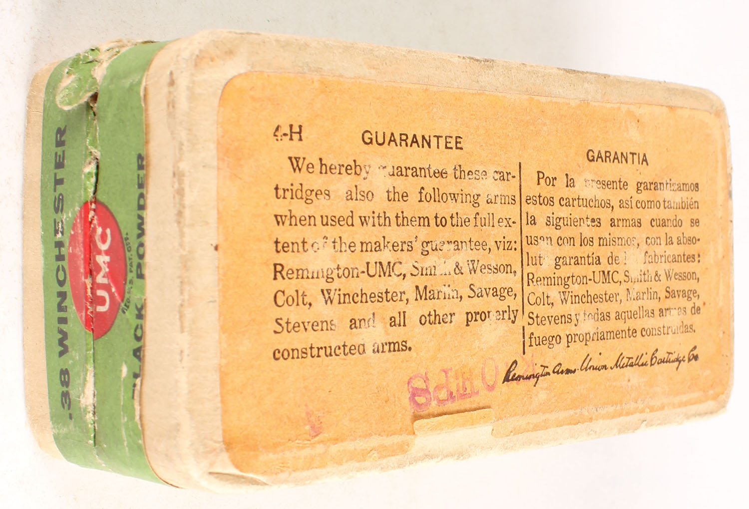 REM-UMC, Central Fire Cartridges, .38 Winchester, 180 Grs. Bullet, Full, 2pc. Buff box with green top & side sealing labels, box is solid with excellent color, minor age soiling, very minor edge & corner wear, front has been written on, labels are intact, ammo is excellent. Grade: Excellent - Value: 30 to 90