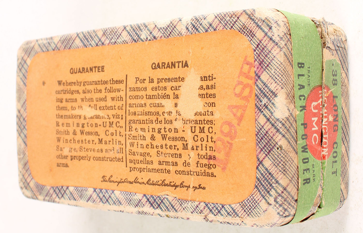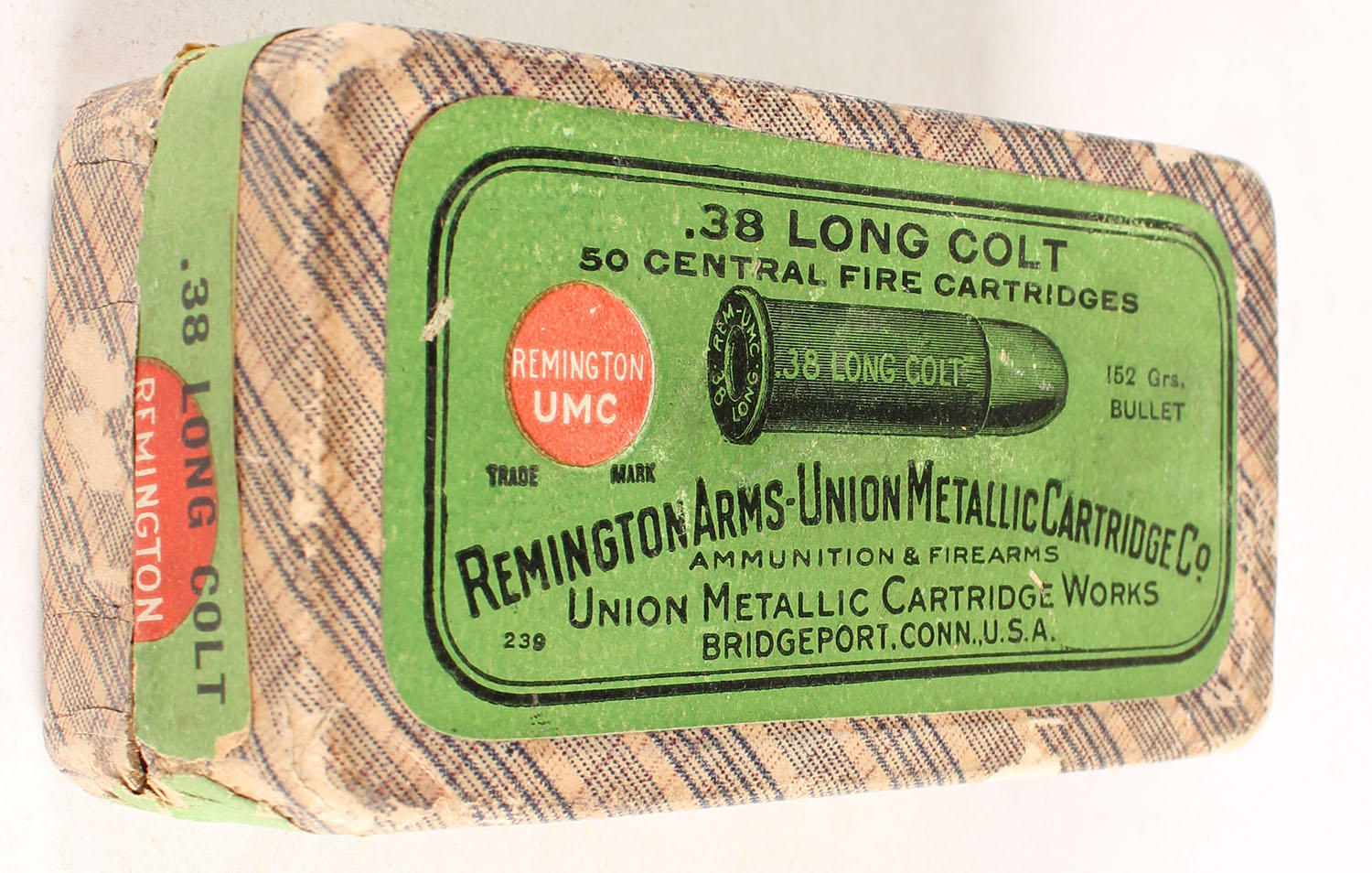 REM-UMC, Central Fire Cartridges, .38 Long Colt, 152 Grs. Bullet, Full, 2pc. Purple fabric box with green top & side sealing labels, box is solid with excellent color, very minor age soiling, & shelf wear, some corner wear, side sealing label is 95% intact, ammo is very good to excellent. Grade: Very Good ++ - Value: 20 to 60