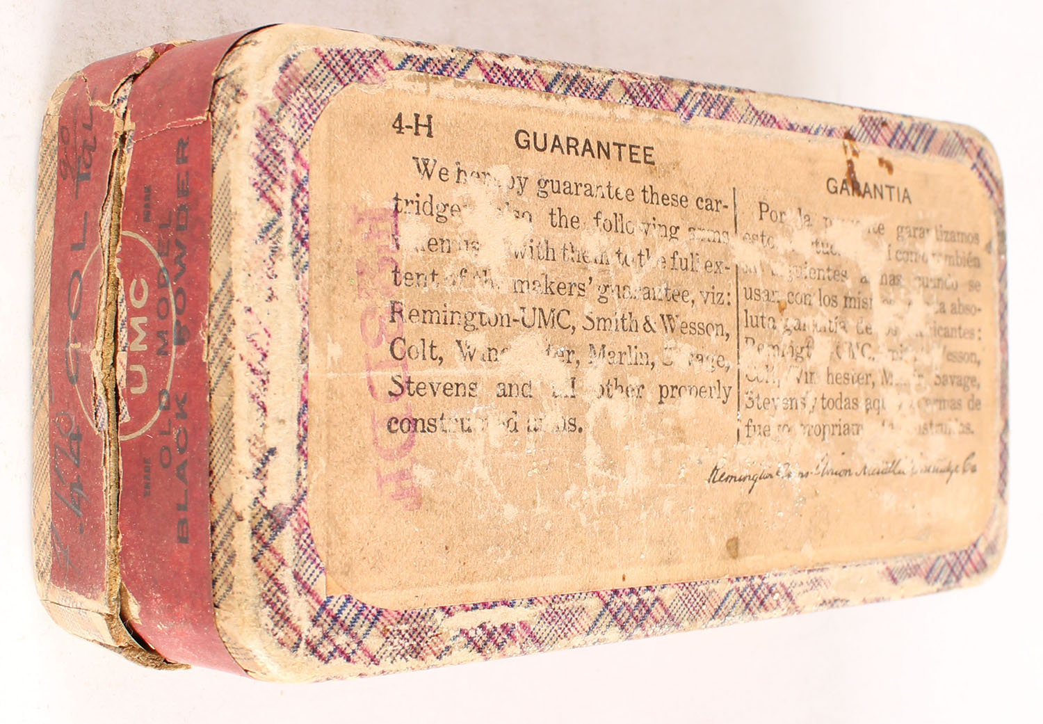 REM-UMC, Central Fire Cartridges, .44 Colt (Old Model), 210 Grs. Bullet, Black Powder, Full of mixed H/S, 2pc. Purple fabric box with red top & side sealing labels, box is solid with good color, some age soiling, shelf wear, top has been written on, some edge & corner wear, side sealing label is 95% intact, ammo is very good. Grade: Very Good - Value: 16 to 60