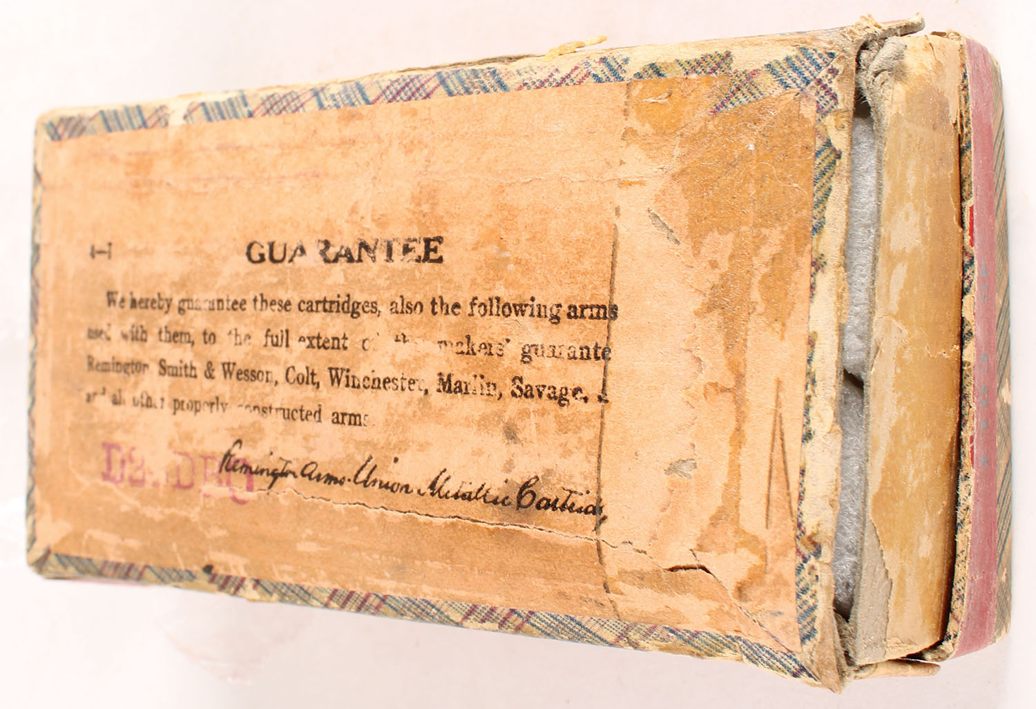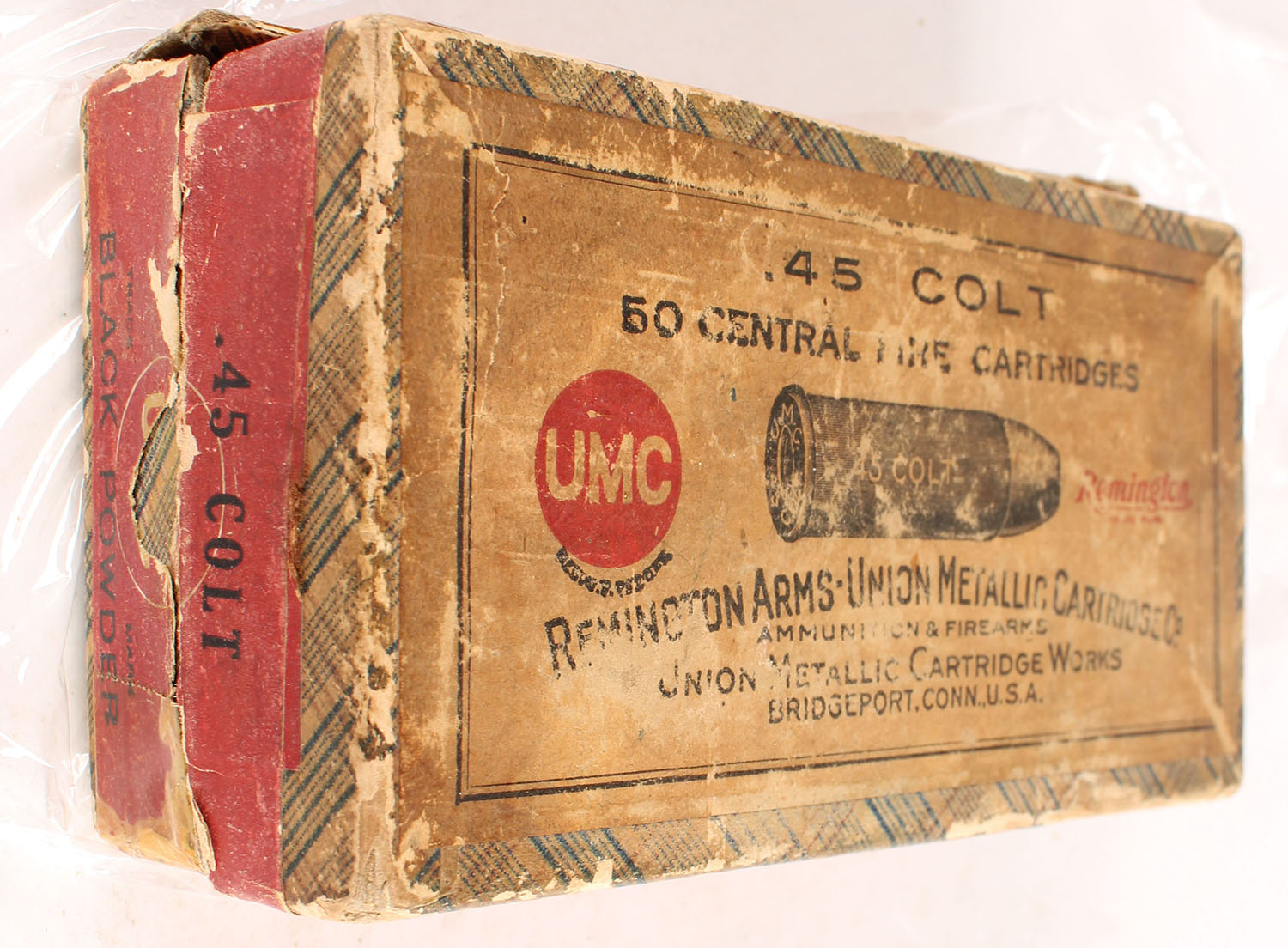 REM-UMC, Central Fire Cartridges, .45 Colt, Black Powder, Partial 34rds. 2pc. Purple fabric box with buff top & red side sealing labels, box has several seam splits, has several tape repaired seam splits, fair color, age soiling, shelf wear, edge & corner wear, side sealing label is 90% intact, ammo is excellent. Grade: Fair - Value: 8 to 40