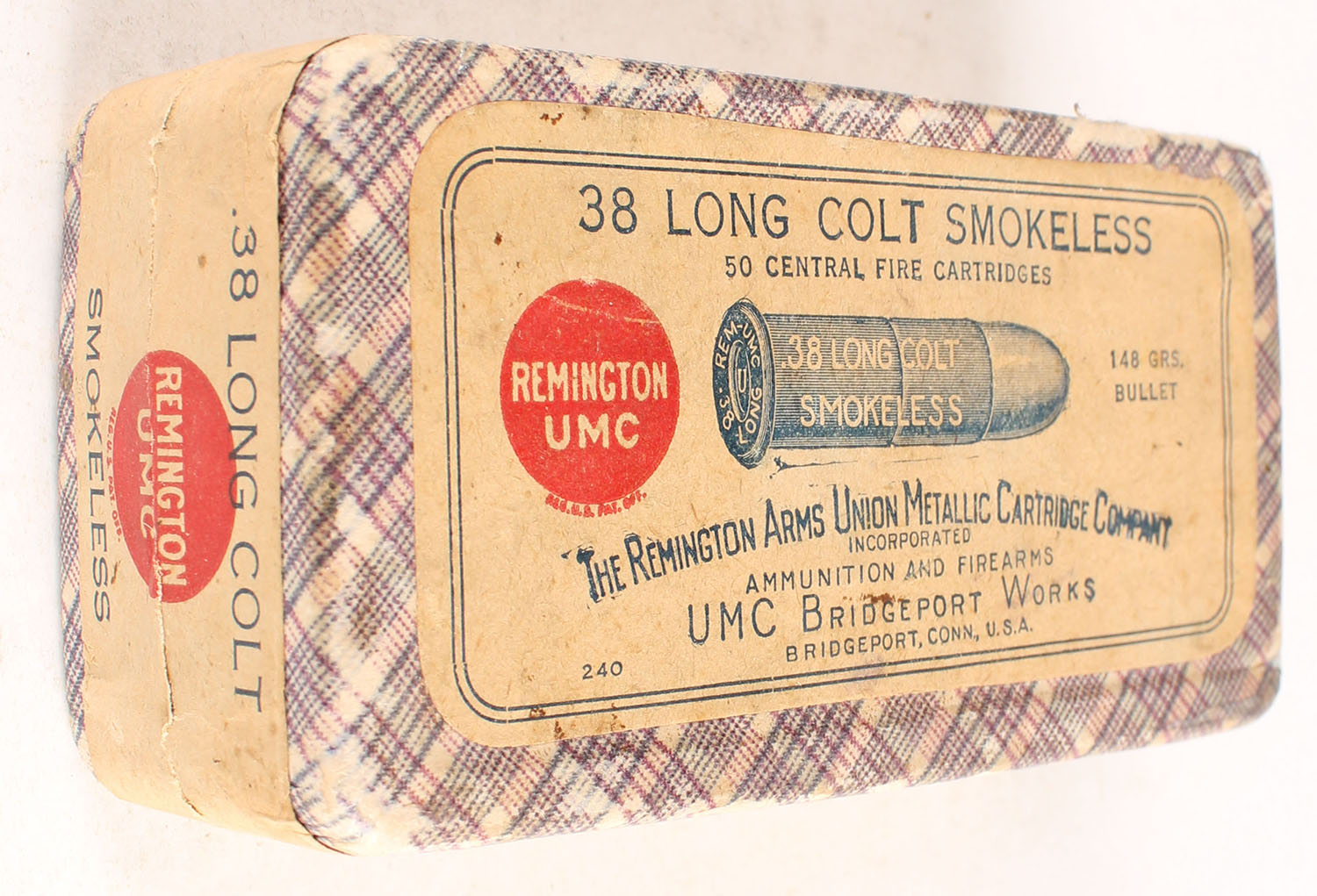 REM-UMC, Central Fire Cartridges, .38 Long Colt, 148 Grs. Bullet, Smokeless, FULL & SEALED, 2pc. Purple fabric box with buff top & side sealing labels, box is solid with excellent color, very minor edge & corner wear, labels are intact. Grade: Excellent + - Value: 40 to 120