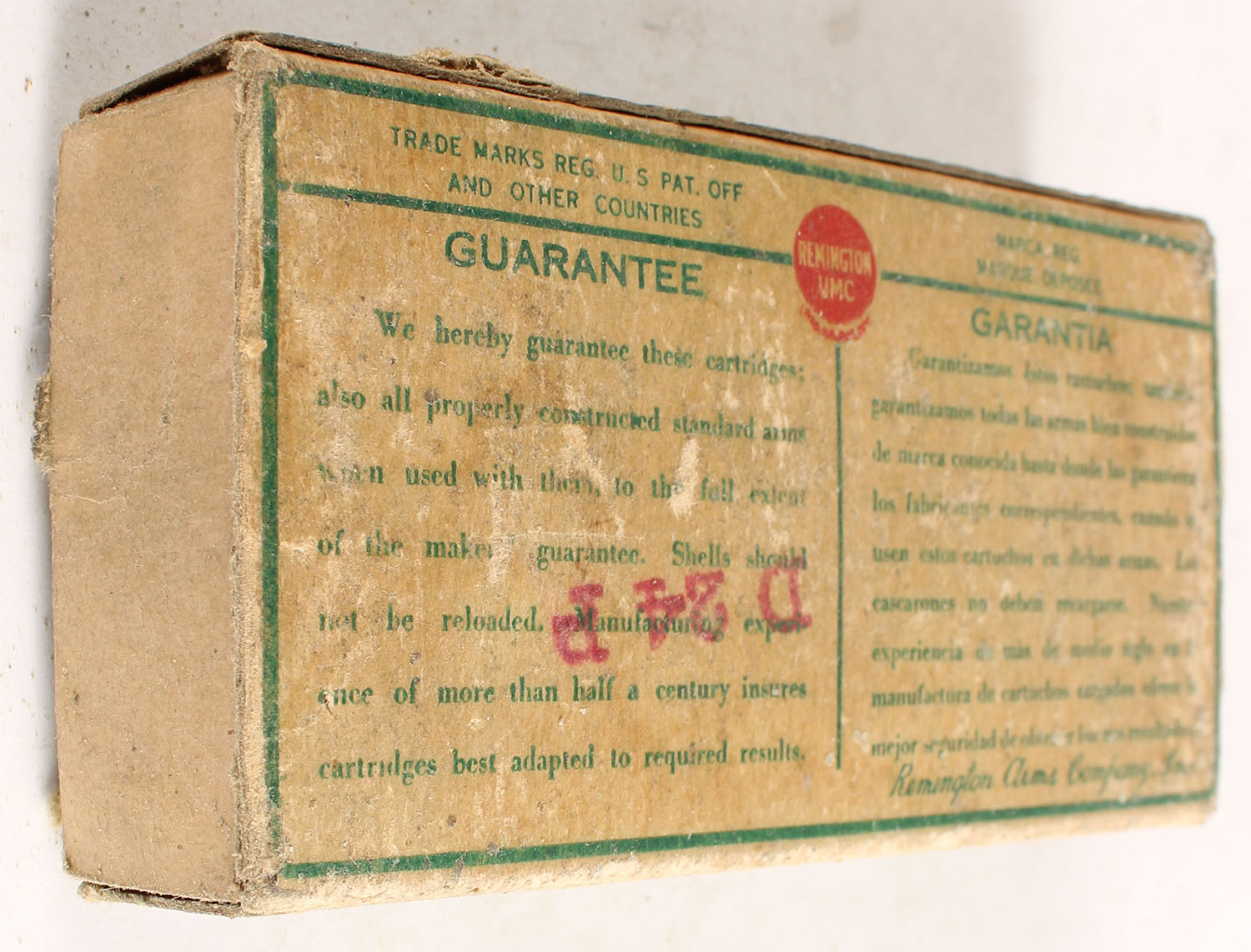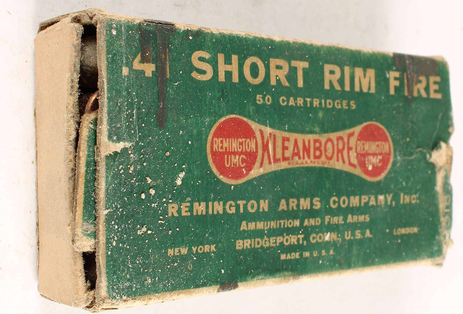 Remington, Kleanbore, .41 Short Rim Fire, Full of mixed H/S, 1pc. Green buff & red dog bone box, box is missing both end flaps, fair color, age soiling, staining, minor shelf wear, corner wear, minor edge wear, ammo is good. Grade: Fair - Value: 50 to 150