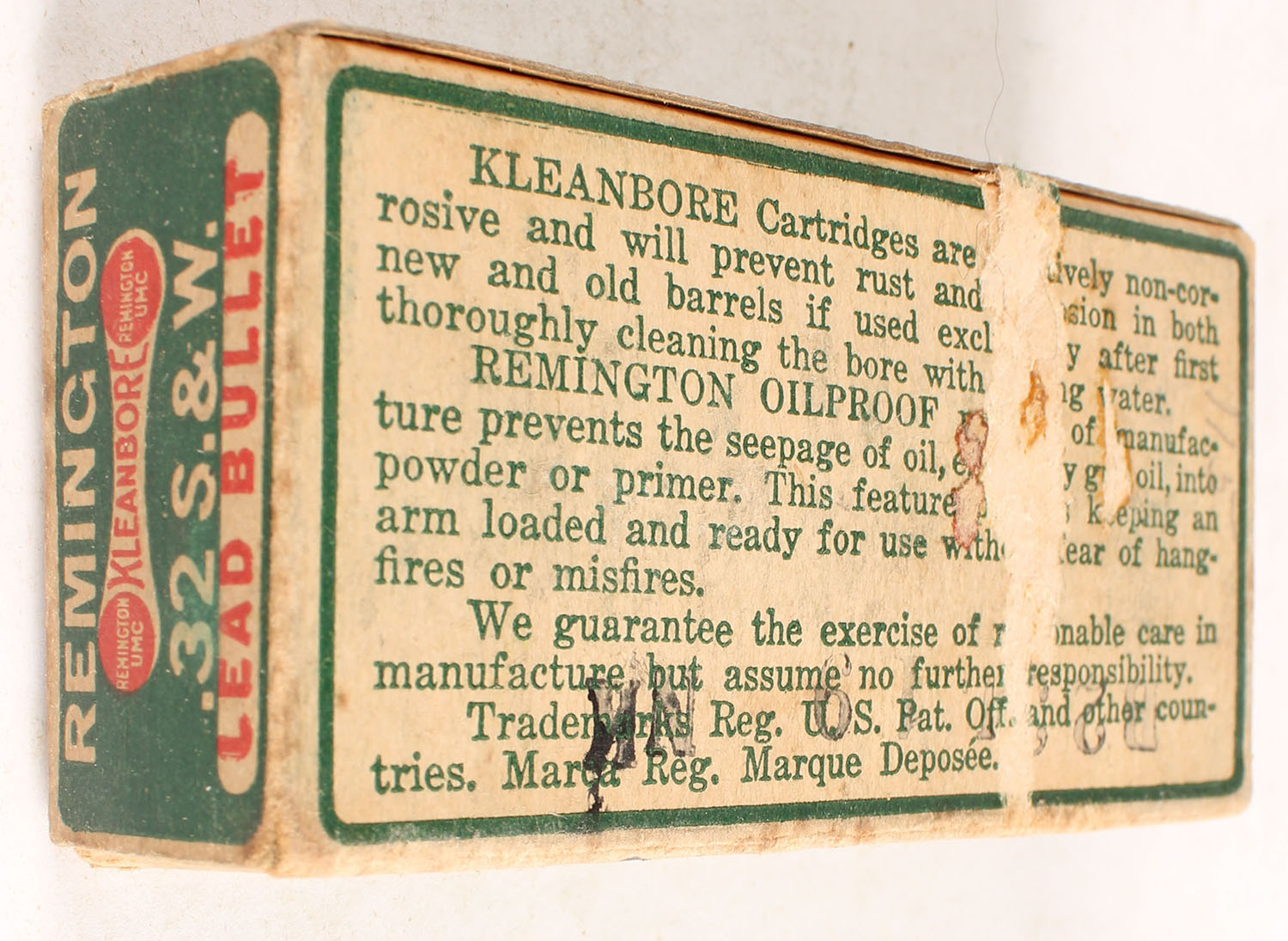 Remington, Kleanbore, .32 Smith & Wesson, 88 Grs. Lead Bullet, Partial 25rds. 1pc. Green brown & red dog bone box, box is solid with very good color, some age soiling, corner wear, minor edge wear, scuff on bottom, end flaps are solid, ammo is very good. Grade: Very Good + - Value: 8 to 40
