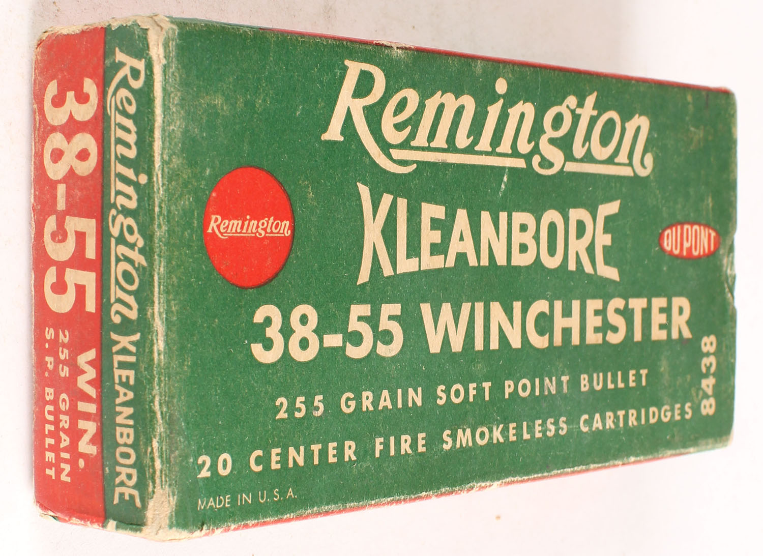 Remington, Kleanbore, .38-55 Winchester, 255 Grain Soft Point Bullet, Full, 1pc. Green buff & red box, box is solid with very good color, some age soiling & shelf wear, some edge & corner wear, stain on front, end flaps are solid, ammo is very good to excellent - Value: 20 to 60