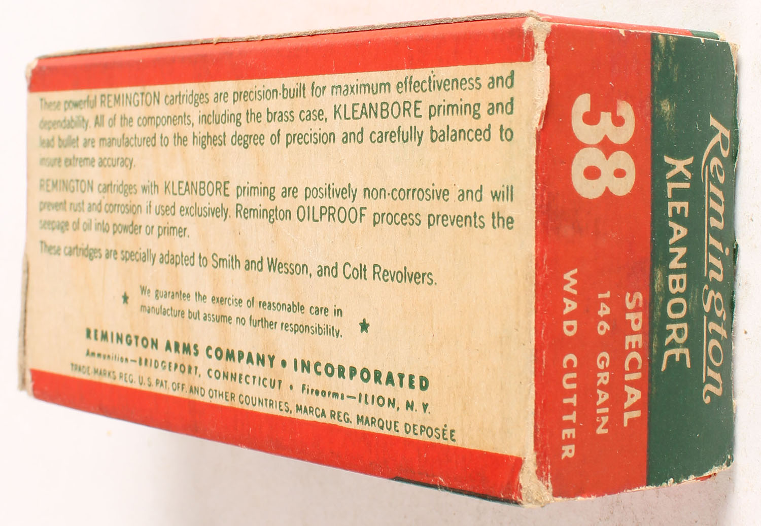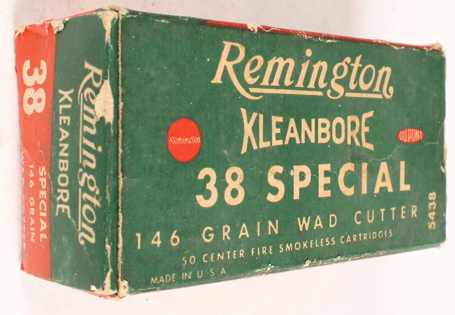Remington, Kleanbore, .38 Special, 146 Grain Wad Cutter, Full, 1pc. Green buff & red box, box is solid with very good color, minor age soiling, some corner wear, very minor edge wear, end flaps are solid, ammo is excellent. Grade: Excellent - Value: 10 to 40