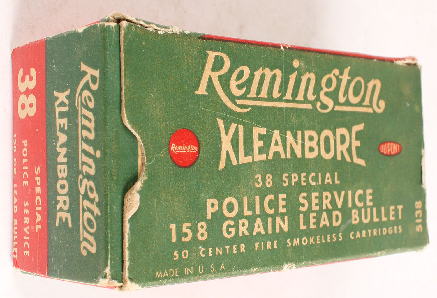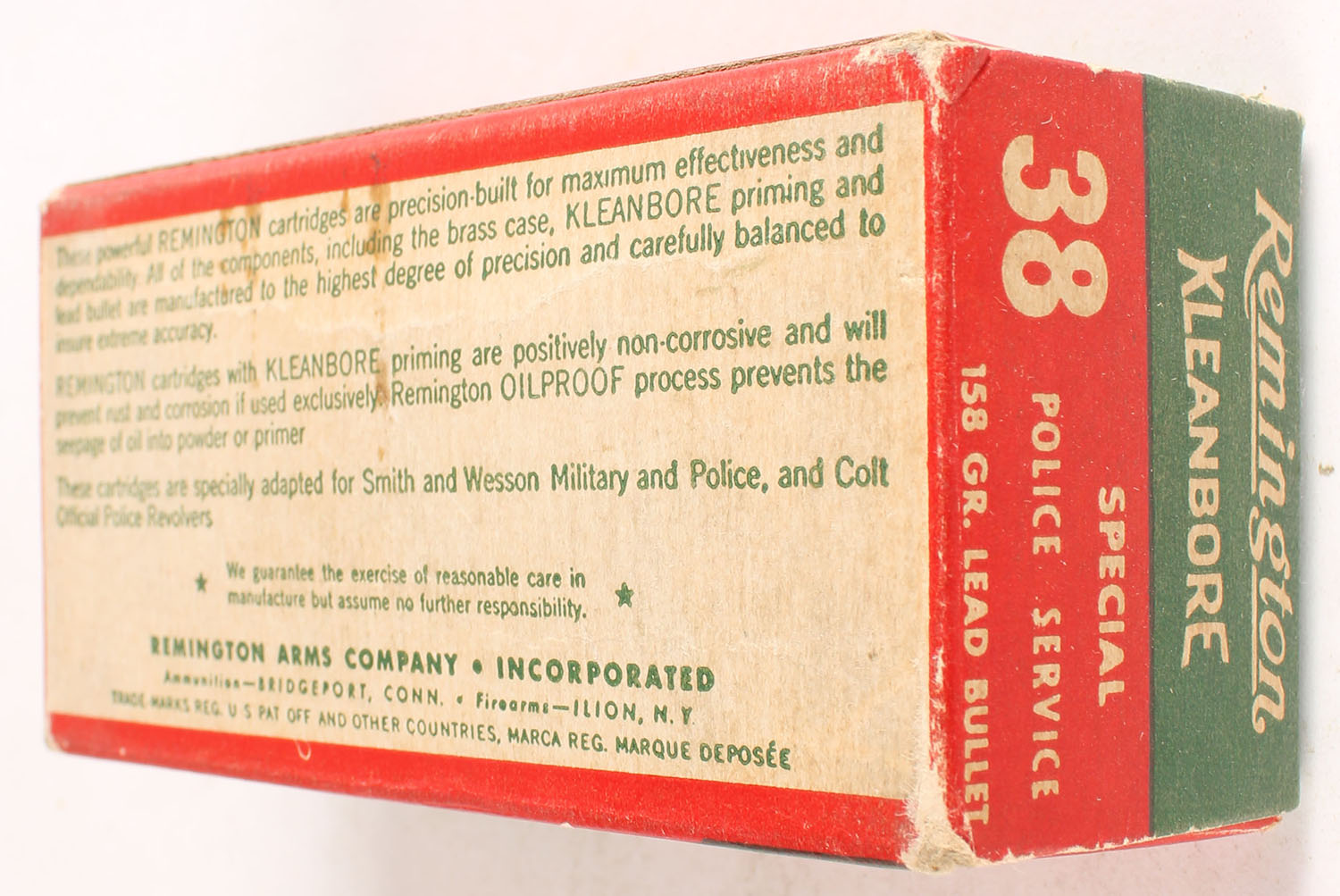 Remington, Kleanbore, .38 Special Police Service, 158 Grain Lead Bullet, Partial 34rds. 1pc. Green red & buff box is solid with very good color, minor age soiling & color fading, some corner wear, very minor edge wear, end flaps are solid, ammo is excellent. Grade: Excellent - Value: 6 to 30
