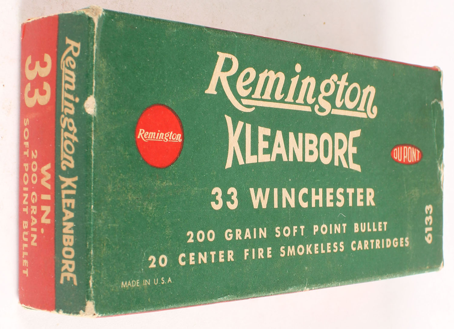 Remington, Kleanbore, .33 Winchester, .200 Grain Soft Point Bullet, Full, 1pc. Green buff & red box, box is solid with excellent color, very minor age soiling, minor corner wear, very minor edge wear, end flaps are solid, ammo is fair. Grade: Excellent - Value: 50 to 150