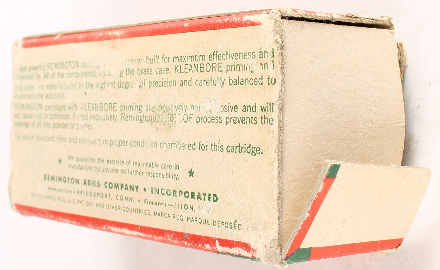 Remington, Kleanbore, .32 Winchester (.32-20), 100 Grain Lead Bullet, Partial 37 rds., 1pc. Green red & white box, missing right end flap, partial seam split to top front edge, edge & corner wear, left end flap is solid, ammo is excellent. Grade: Fair ++ - Value: 20 to 80