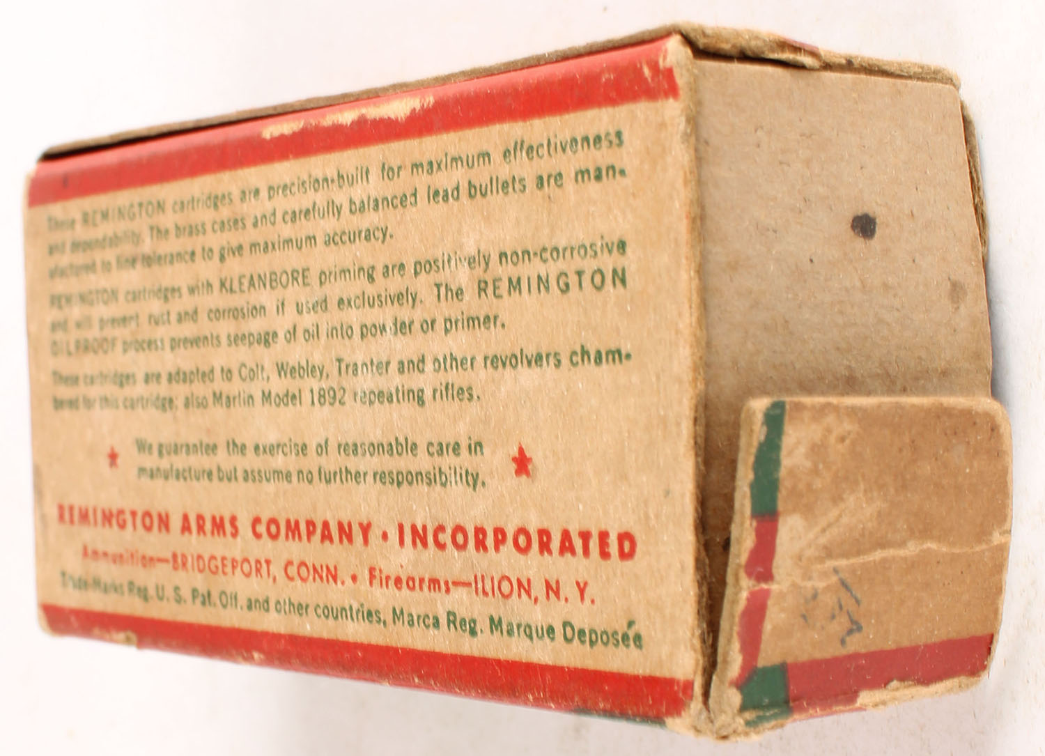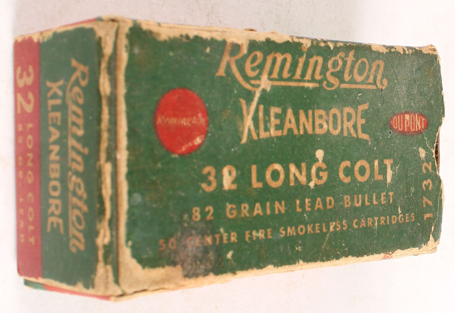 Remington, Kleanbore, .32 Long Colt, 82 Grain lead Bullet, Partial 44rds. correct, 1pc. Green red & buff box, missing right end flap, fair color, age soiling, edge & corner wear, left end flap is solid, ammo is very good to excellent. Grade: Fair ++ - Value: 10 to 50