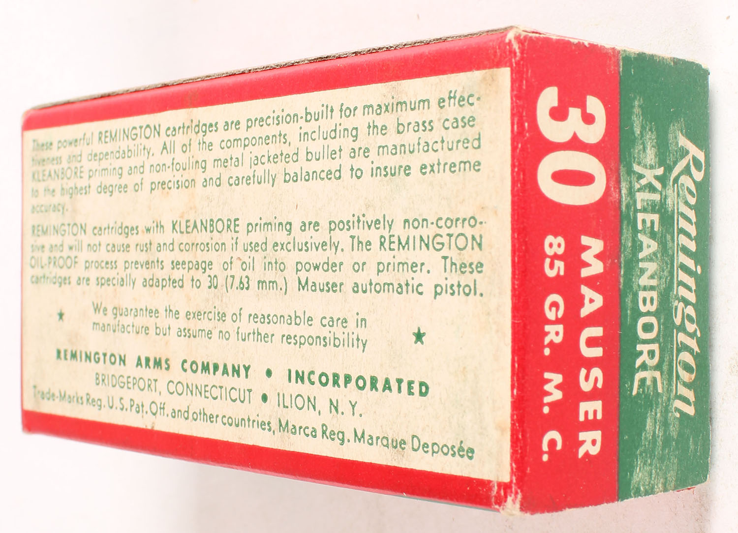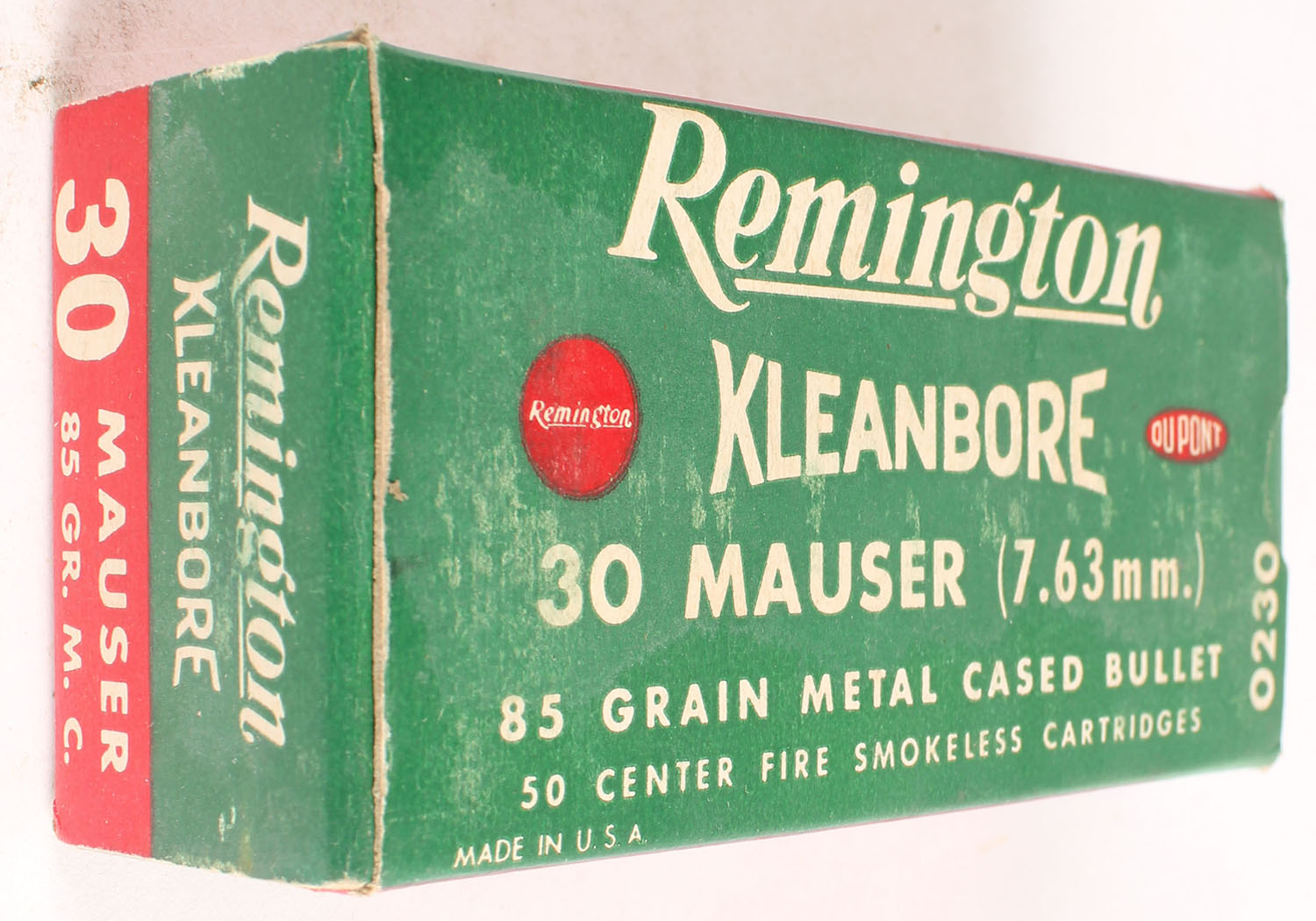 Remington, Kleanbore, .30 Mauser (7.63mm), 85 Grain Metal Cased Bullet, Full, 1pc. Green white & red box, box is solid with excellent color, minor shelf wear, very minor corner wear, edges are crisp, end flaps are solid, ammo is excellent. Grade: Excellent + - Value: 10 to 40
