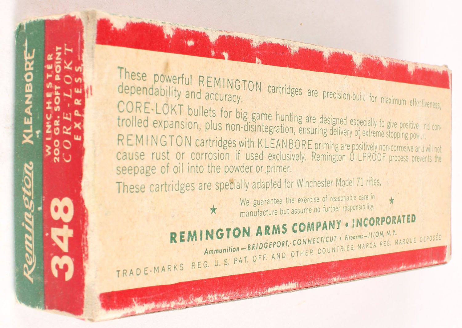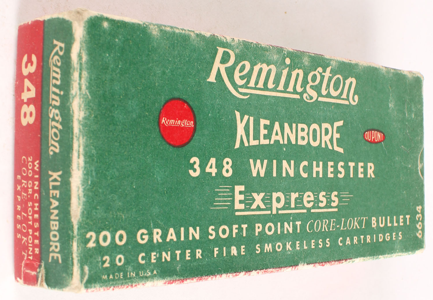 Remington, Kleanbore Express, .348 Winchester, 200 Grain Soft Point Core-Lokt Bullet, Full, 1pc. Green buff & red box, box is solid with very good to excellent color, very minor age soiling & shelf wear, top has been written on, some edge & corner wear, end flaps are solid, ammo is excellent. Grade: Very Good ++ - Value: 40 to 120