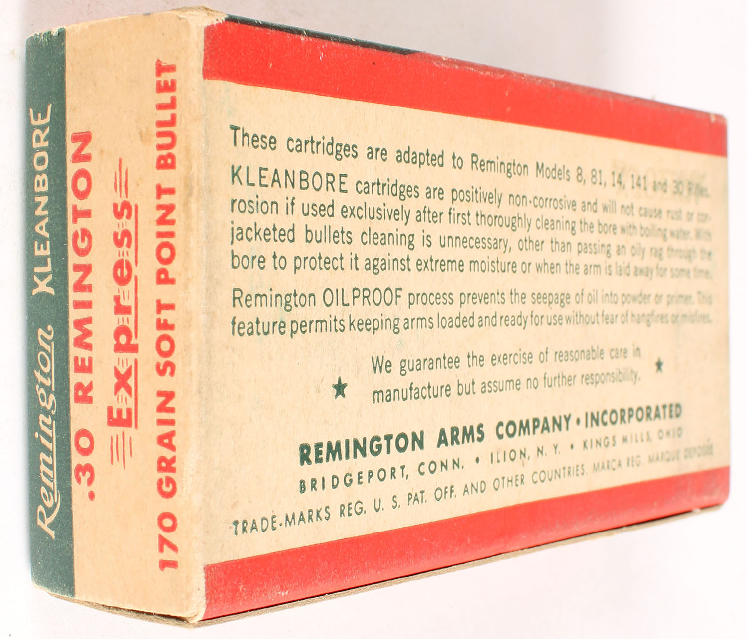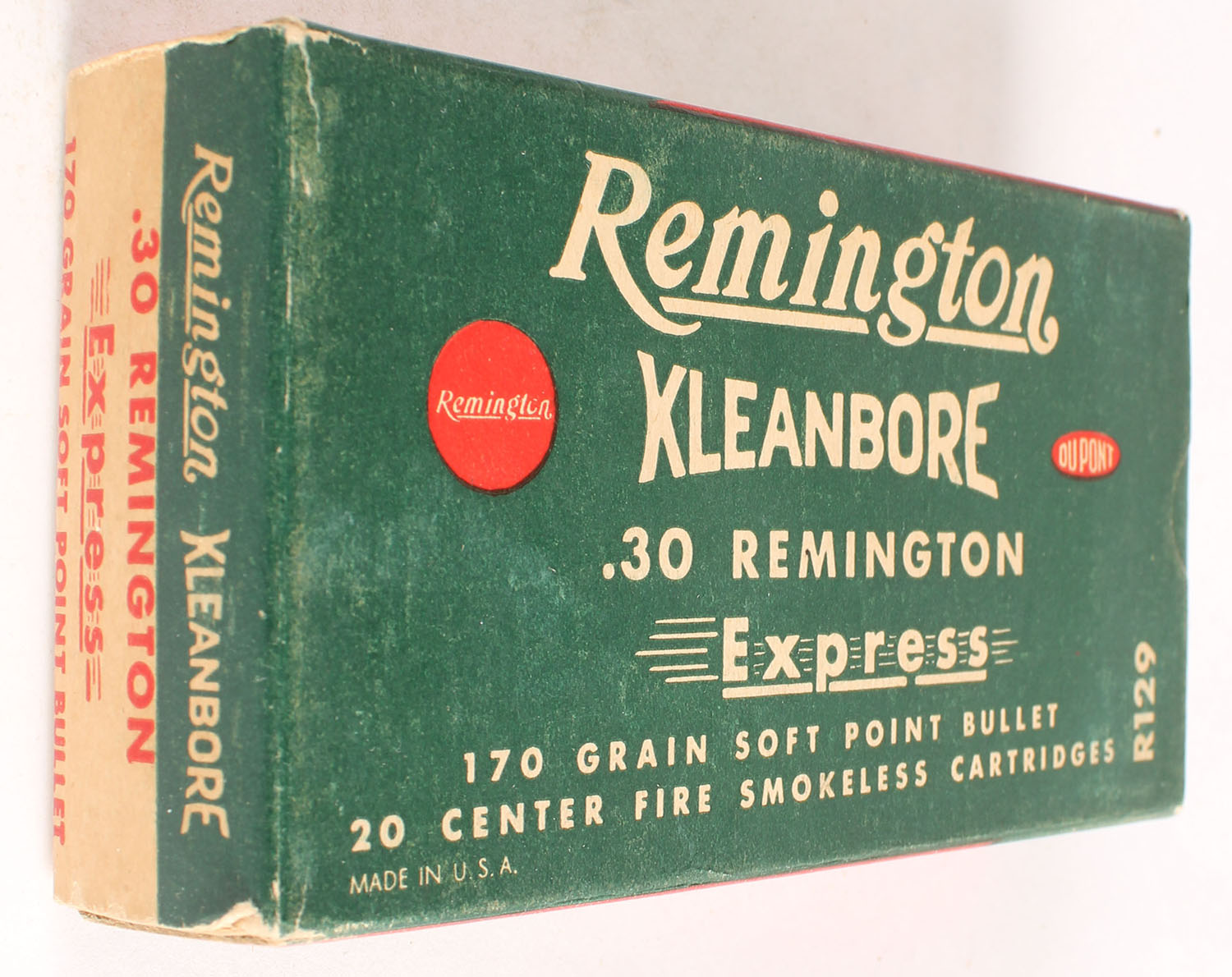Remington, Kleanbore Express, .30 Remington, 170 Grain Soft Point Bullet, Full, 1pc. Green buff & red box, box is solid with excellent color, minor shelf & corner wear, edges are crisp, end flaps are solid, ammo is very good to excellent. Grade: Excellent + - Value: 20 to 60