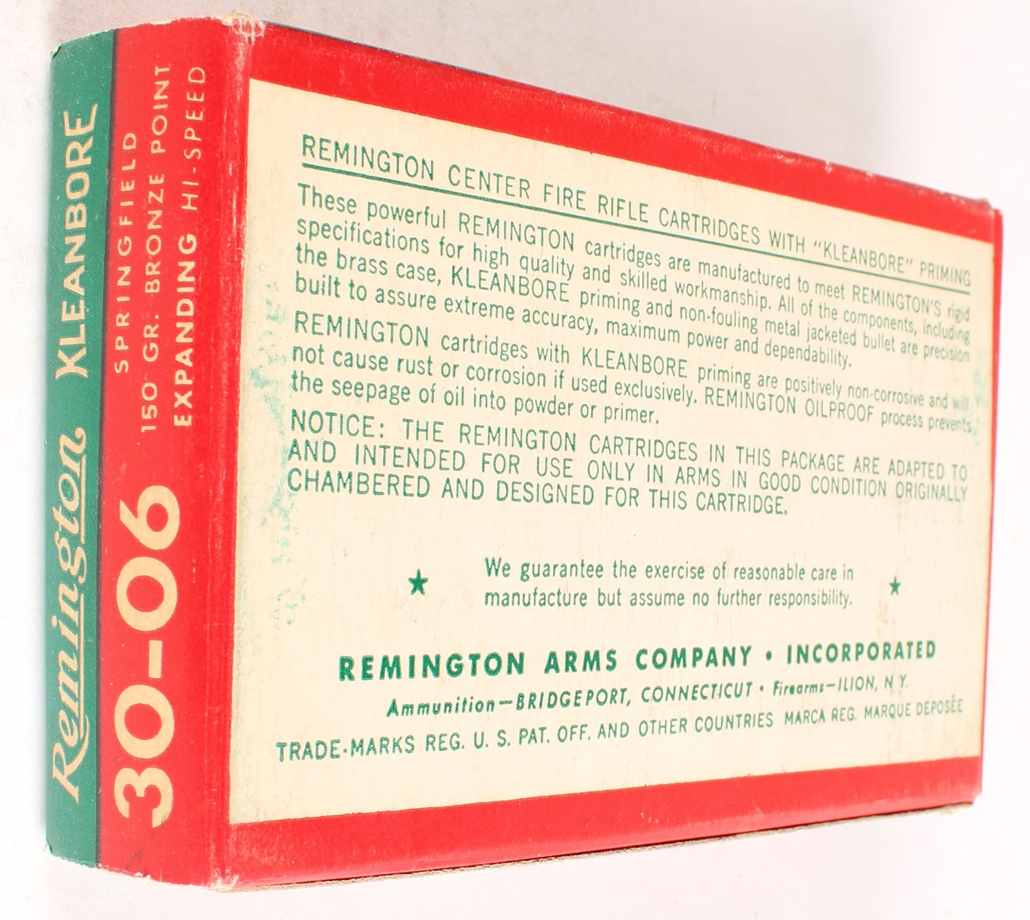 Remington, Kleanbore Hi-Speed, .30-06 Springfield, 150 Grain Bronze Point Bullet, Full, 1pc. Green white & red box, box is solid with excellent color, minor corner wear, edges are crisp, end flaps are solid, ammo is excellent. Grade: Excellent + - Value: 10 to 40