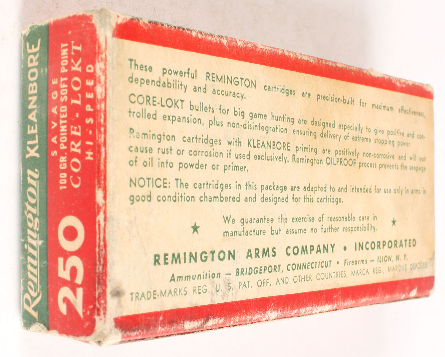 Remington, Kleanbore Hi-Speed, .250 Savage, 100 Gr. Pointed Soft Point Core-Lokt Bullet, Partial 17rds., 1pc. Green buff & red box, box is solid with very good color, minor age soiling & shelf wear, some edge & corner wear, end flaps are solid, ammo is excellent. Grade: Very Good + - Value: 14 to 40