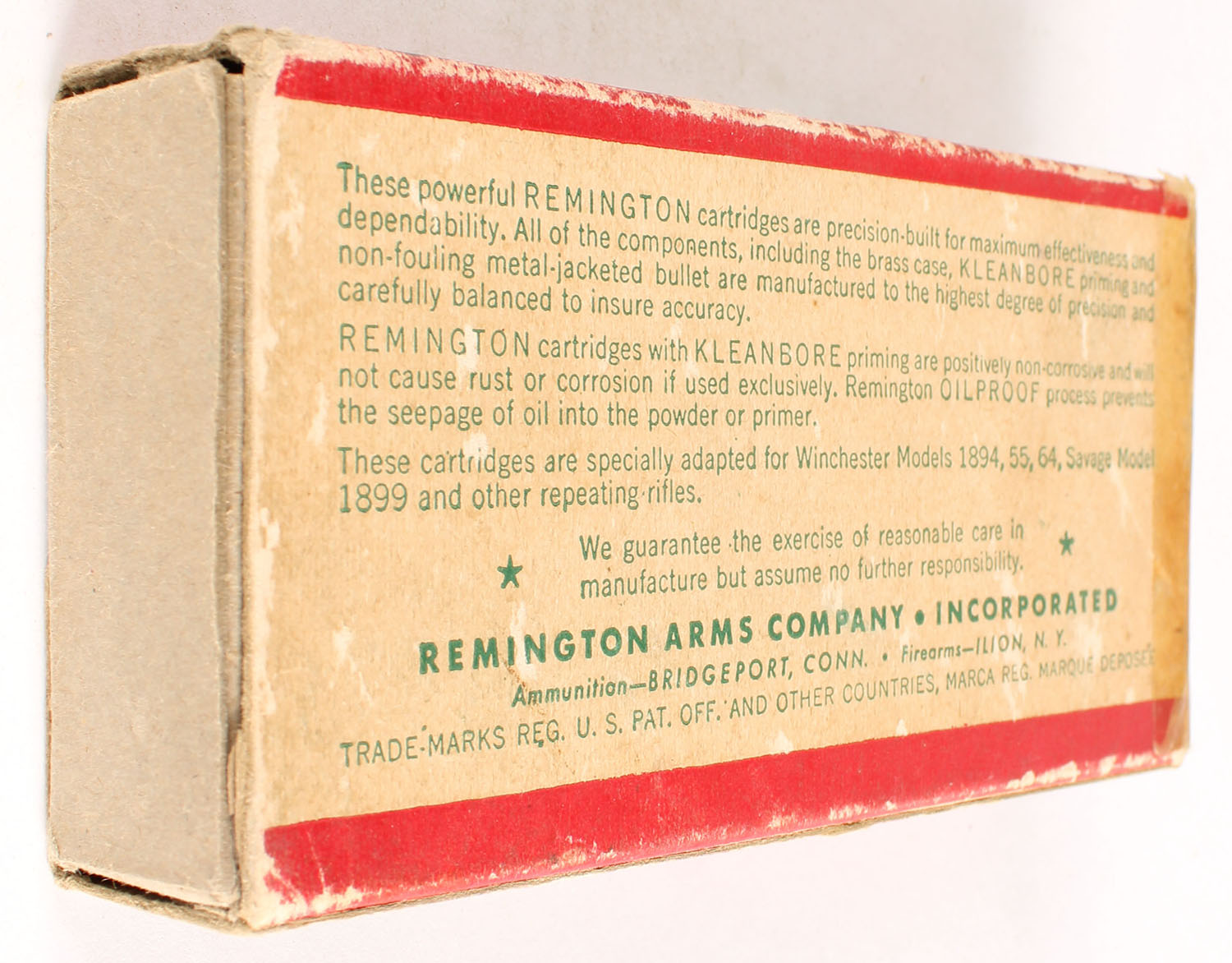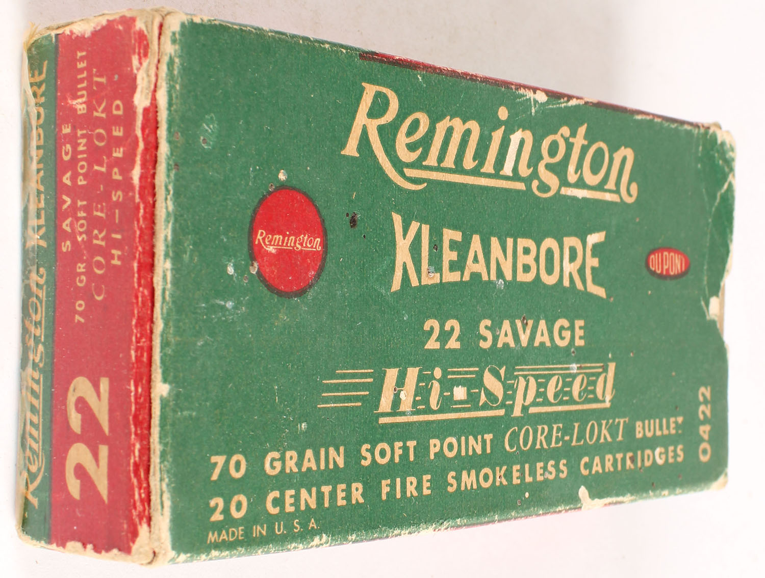 Remington, Kleanbore Hi-Speed, .22 Savage, 70 Grain Soft Point Core-Lokt Bullet, Full, 1pc. Green buff & red box, missing right end flap, very good color, some age soiling, some edge & corner wear, left end flap is solid, ammo is excellent. Grade: Good ++ - Value: 20 to 60