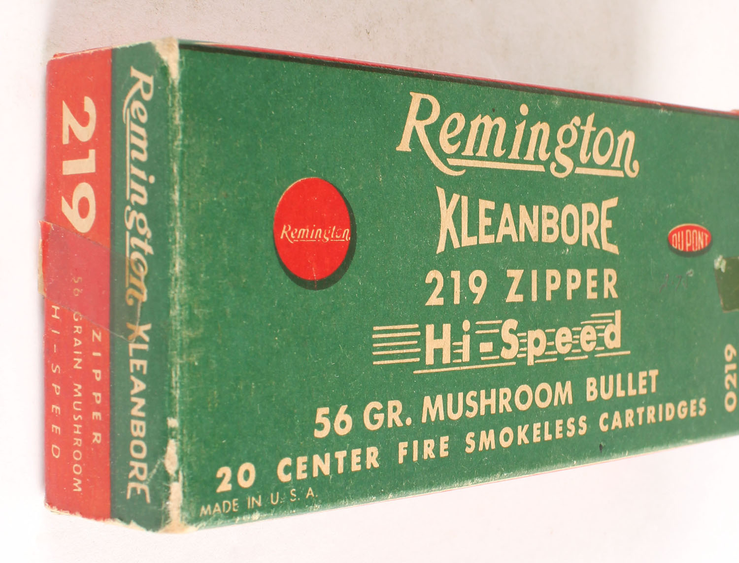 Remington, Kleanbore Hi-Speed, .219 Zipper, 56 Gr. Mushroom Bullet, Full, 1pc. Green buff & red box, box is solid with excellent color, minor age soiling & corner wear, edges are crisp, tape on both ends, end flaps are solid, ammo is excellent. Grade: Excellent - Value: 70 to 210