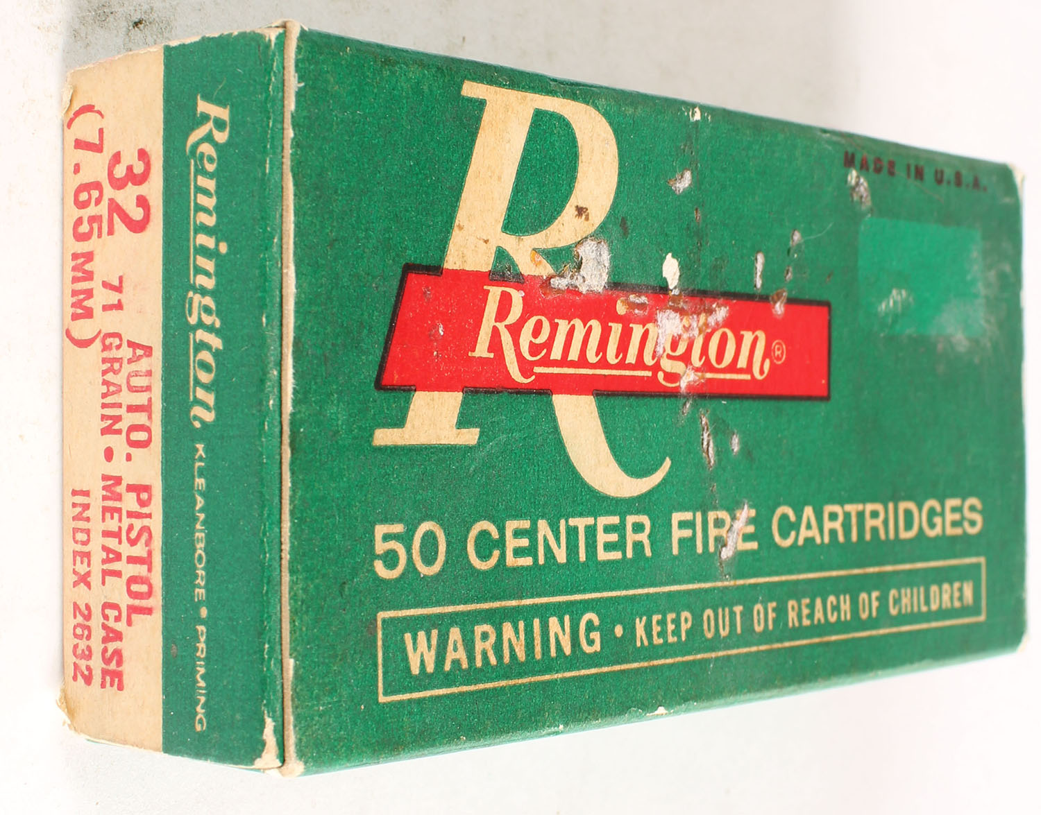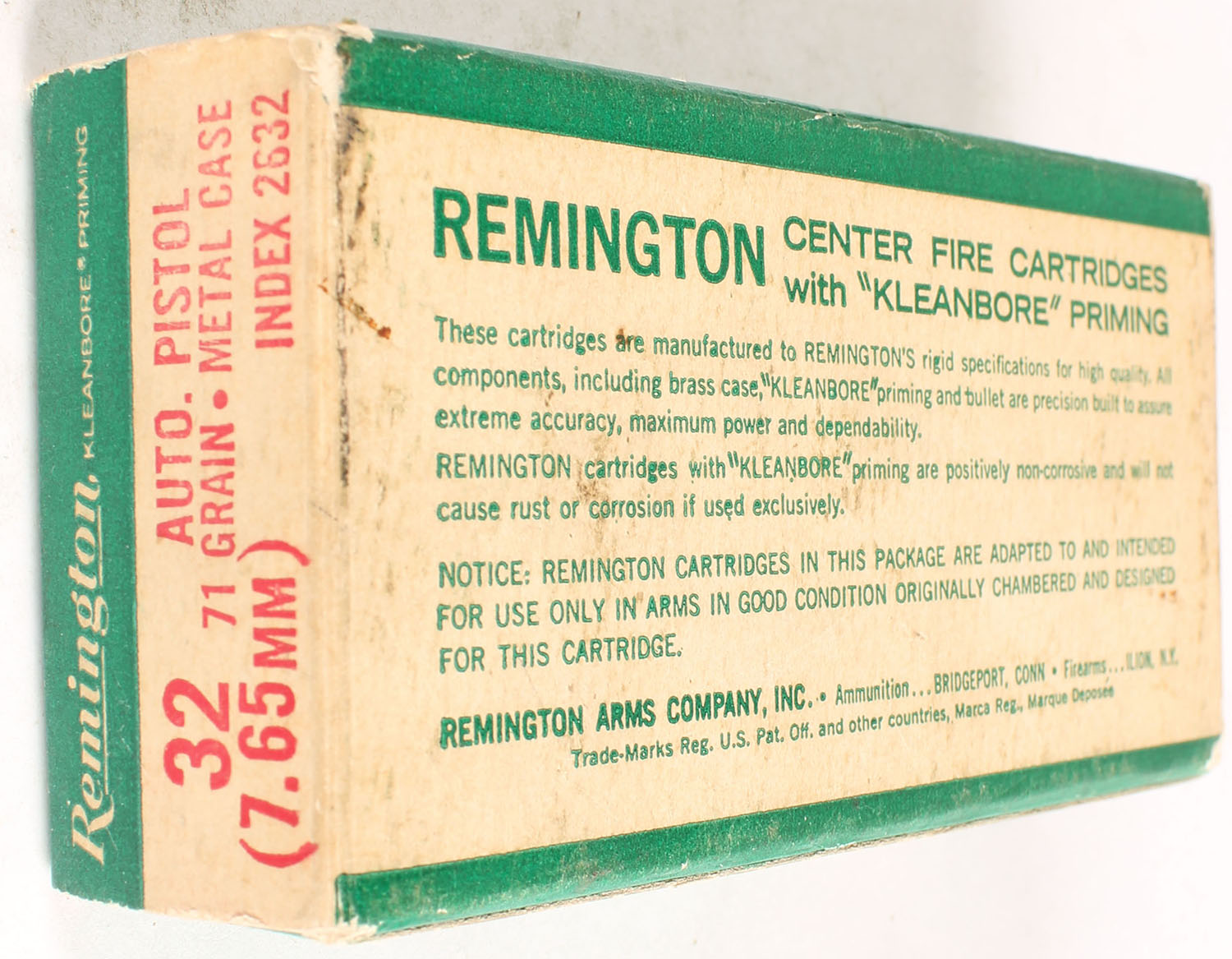 Remington, Center Fire Cartridges, .32 Auto. (7.65mm), 71 Grain Metal Case, Full, 1pc. Green white & red box, box is solid with very good color, some age soiling & shelf wear, ammo is excellent. Grade: Very Good ++ - Value: 10 to 40