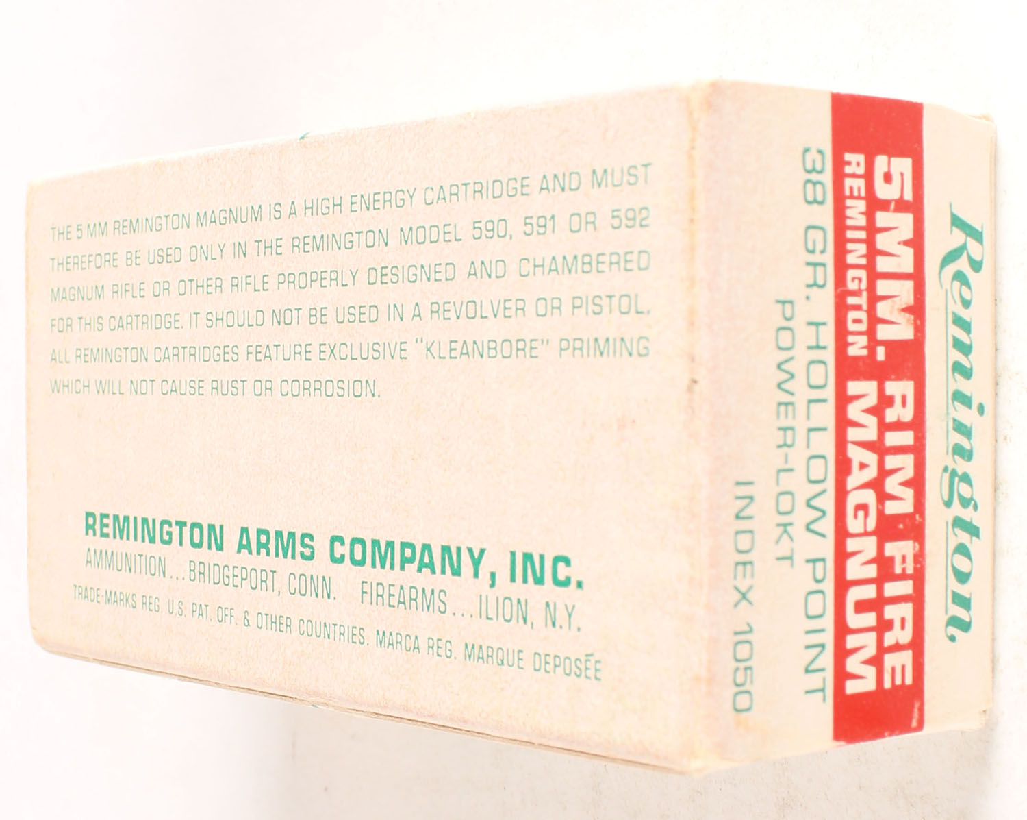 Remington, Hi-Speed, 5mm Remington Rim Fire Magnum, 38 Grain Hollow Point Power-Lokt, Full, 1pc. White red & green box, box is near mint with excellent color, ammo is minty. Grade: Excellent ++ - Value: 30 to 90