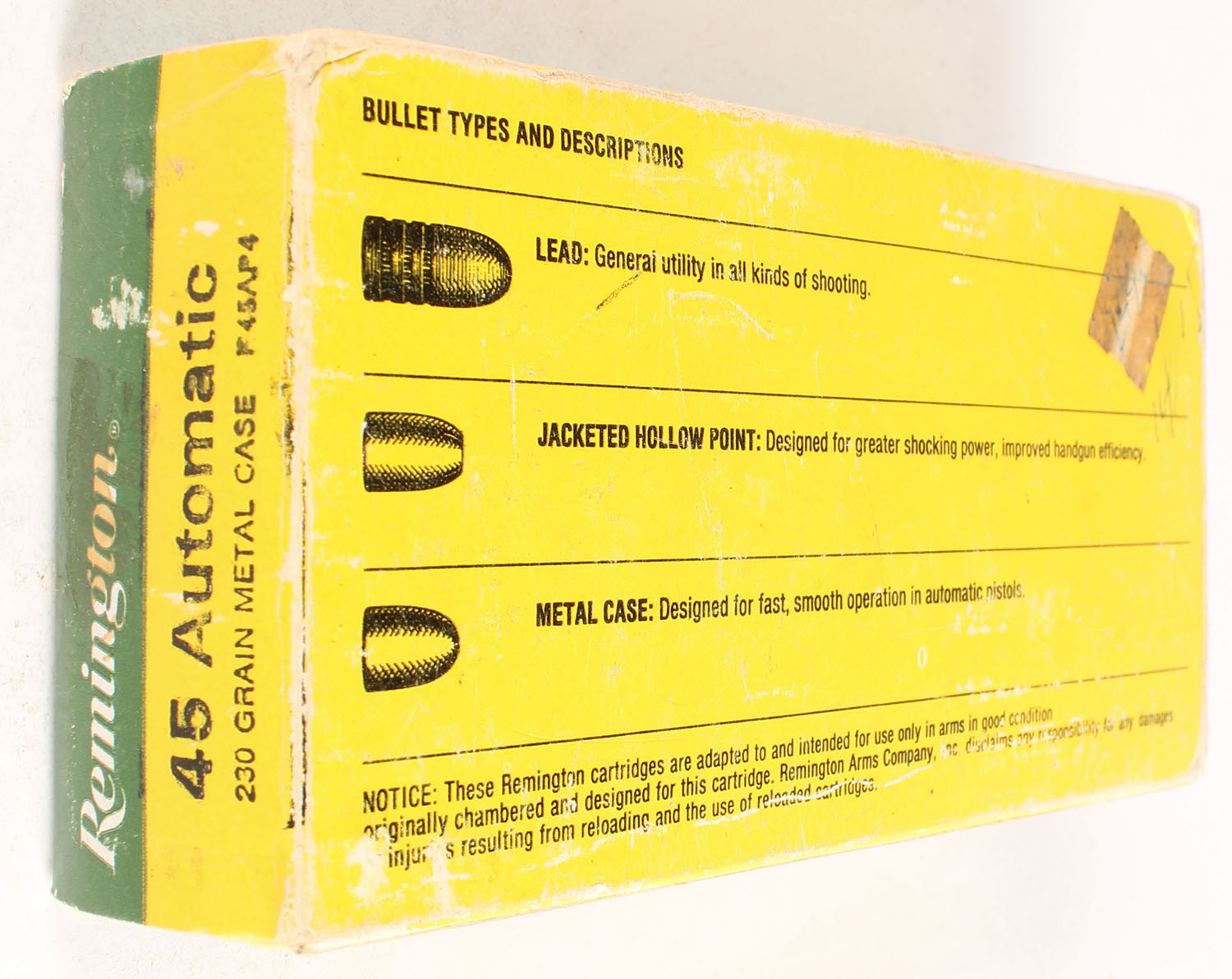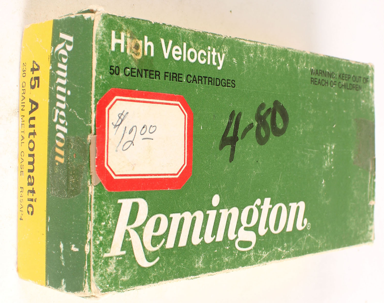 Remington, High Velocity, .45 Automatic, 230 Grain Metal Case, Full, 1pc. Green & yellow box, box is solid with excellent color, some shelf wear, sticker on top, ammo is excellent. Grade: Very Good ++ - Value: 10 to 40