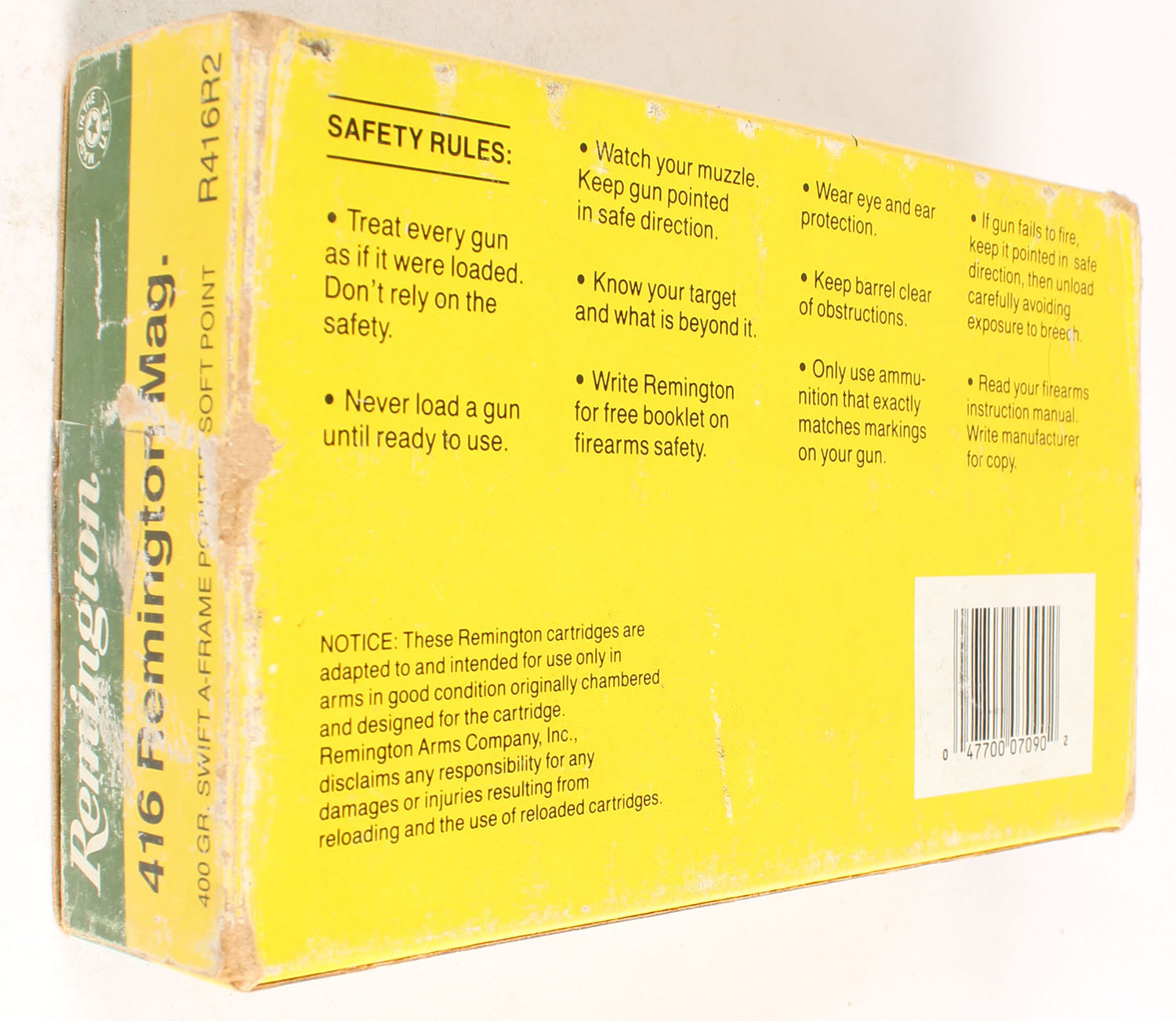 Remington, High Velocity, .416 Remington Magnum, 400 Grain Swift A-Frame Pointed Soft Point, Full, 1pc. Green & yellow box, box is solid with excellent color, shelf & corner wear, ammo is excellent. Grade: Very Good ++ - Value: 30 to 90