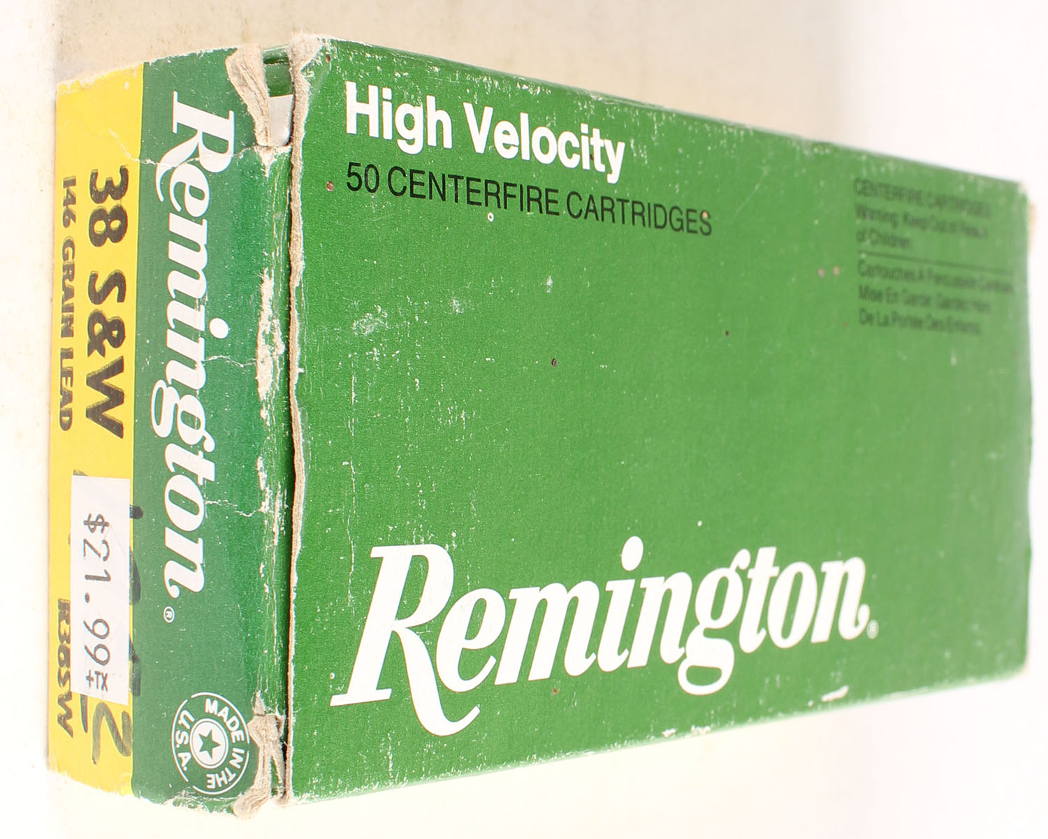 Remington, High Velocity, .38 Smith & Wesson, 146 Grain Lead, Full, 1pc. Green yellow & white box, box is solid with very good color, has shelf & corner wear, very minor edge wear, end flaps are solid, ammo is excellent. Grade: Excellent - Value: 20 to 60