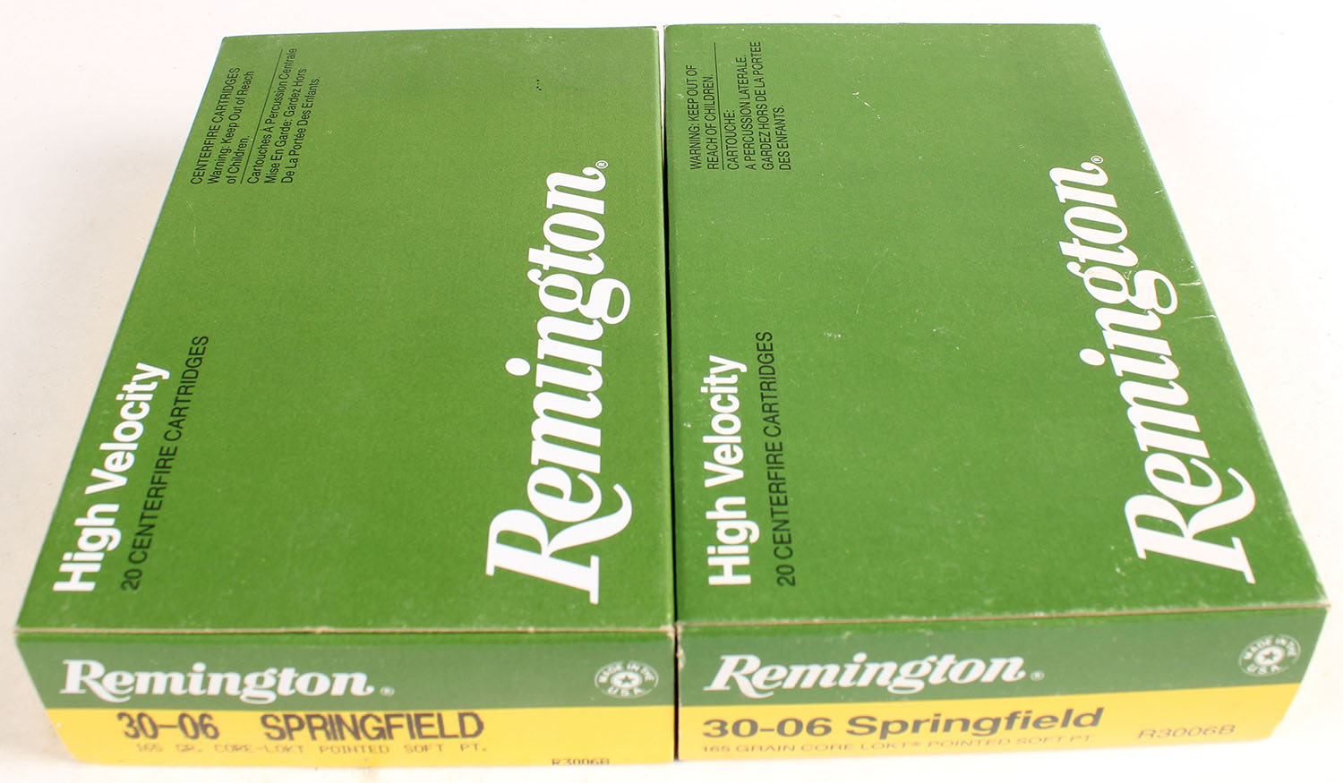 Remington, Lot of (2), High Velocity, .30-06 Springfield, 165 Grain Core-Lokt Pointed Soft Point, Full, 1pc. Green yellow & white box, box is solid with excellent color, end flaps are solid, ammo is excellent. Grade: Excellent ++ - Value: 20 to 80