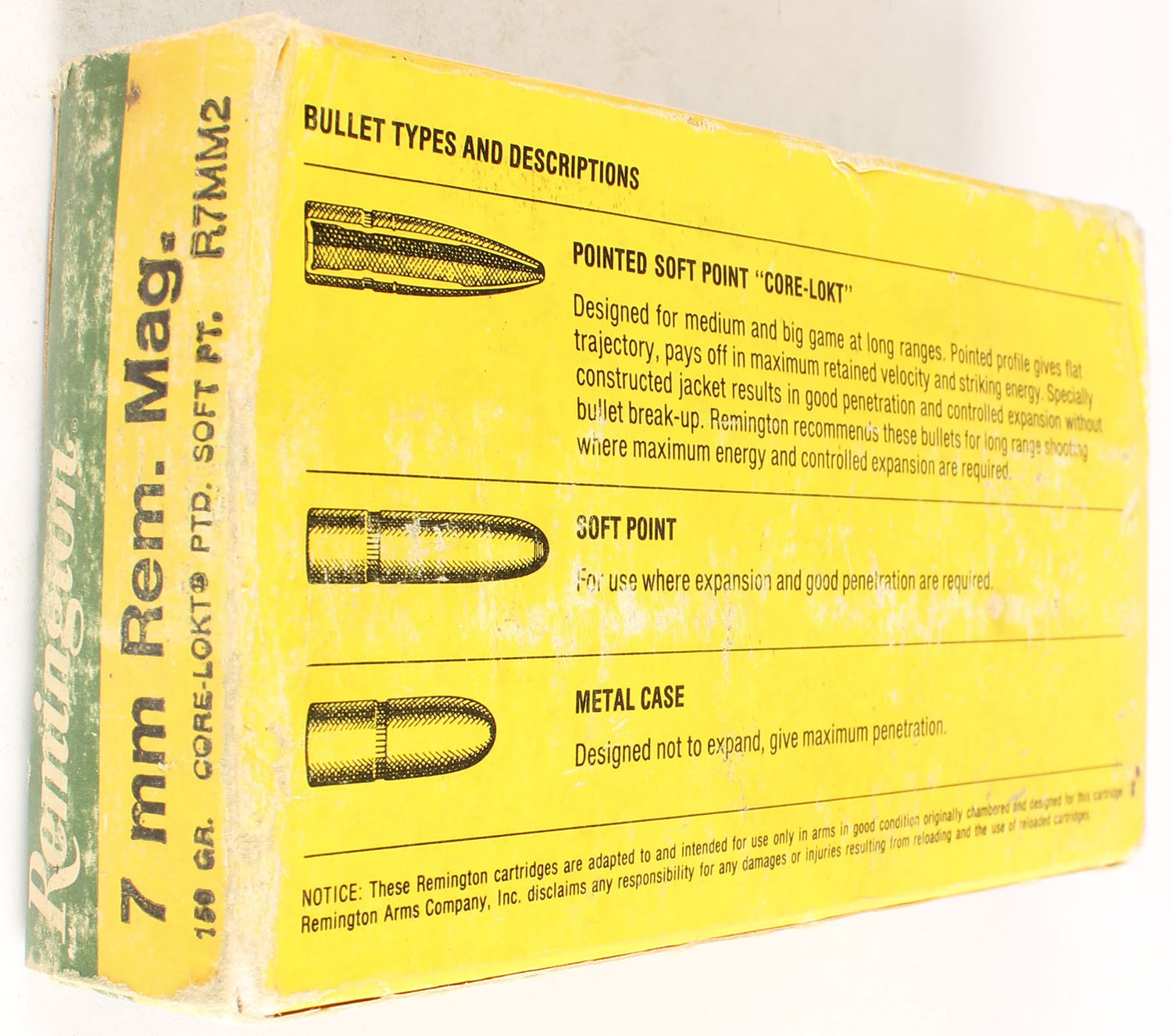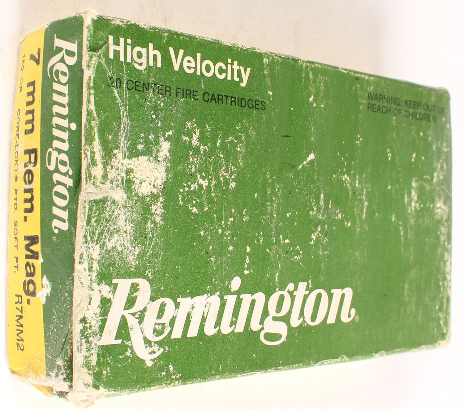 Remington, High Velocity, 7mm Rem Mag, 150 Grain Core-Lokt Pointed Soft Point, Full, 1pc. Yellow, green, white & black box, box has soiling, shelf wear, edge & corner wear, end flaps are solid, ammo is very good. Grade: Good ++ - Value: 10 to 50