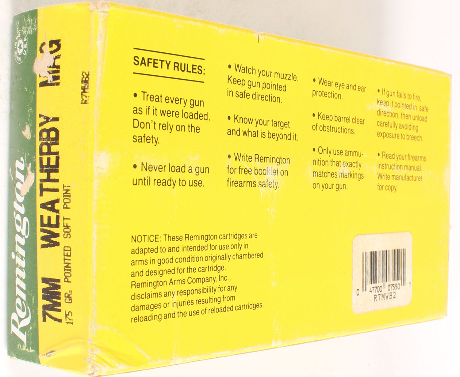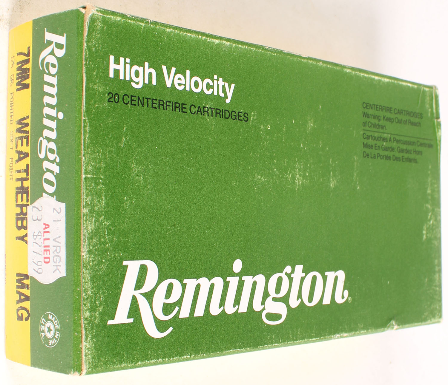 Remington, High Velocity, 7mm Weatherby Mag., 175 Gr. Pointed S.P., 1pc, Full, green/yellow box with white/black print, box is solid with minor rub marks & minor corner wear, ammo is excellent. Grade: Excellent - Value: 30 to 60
