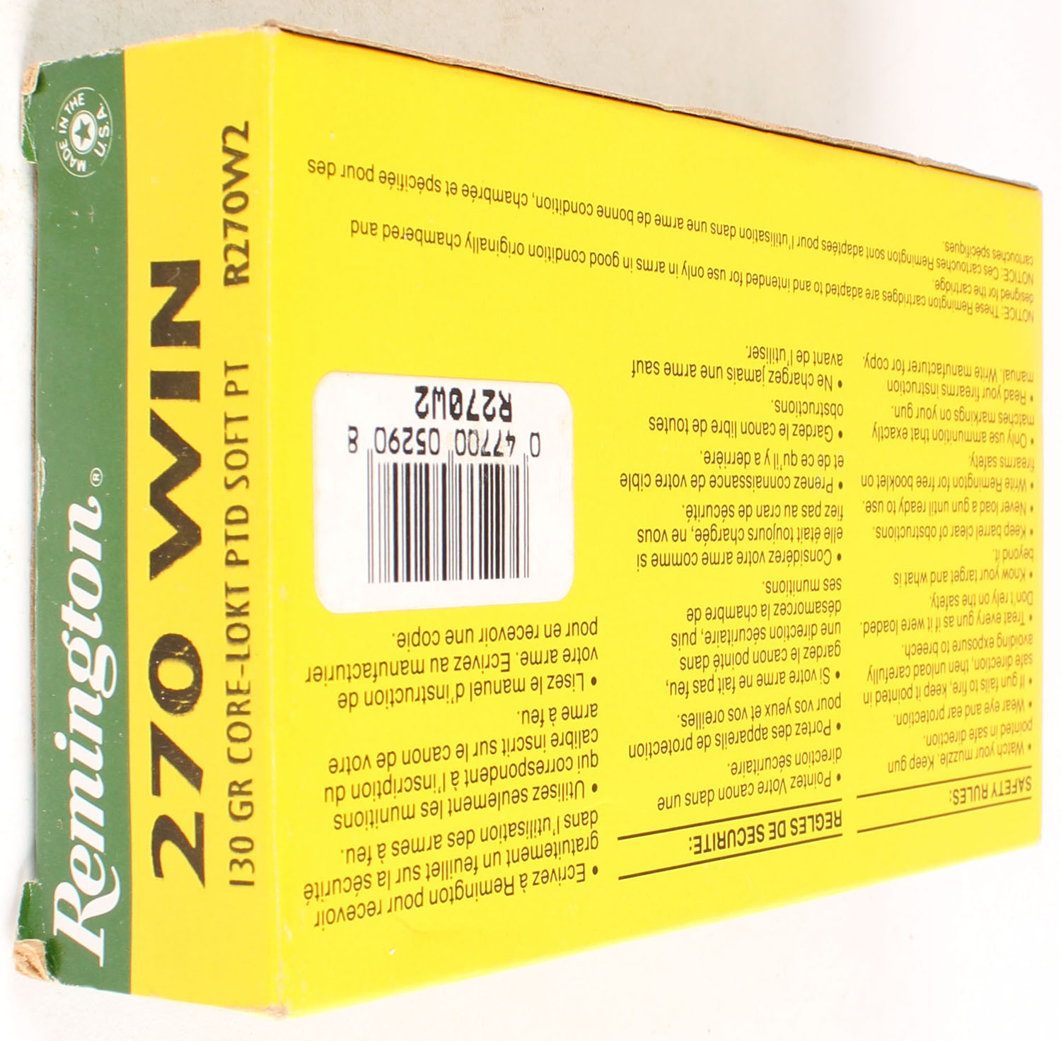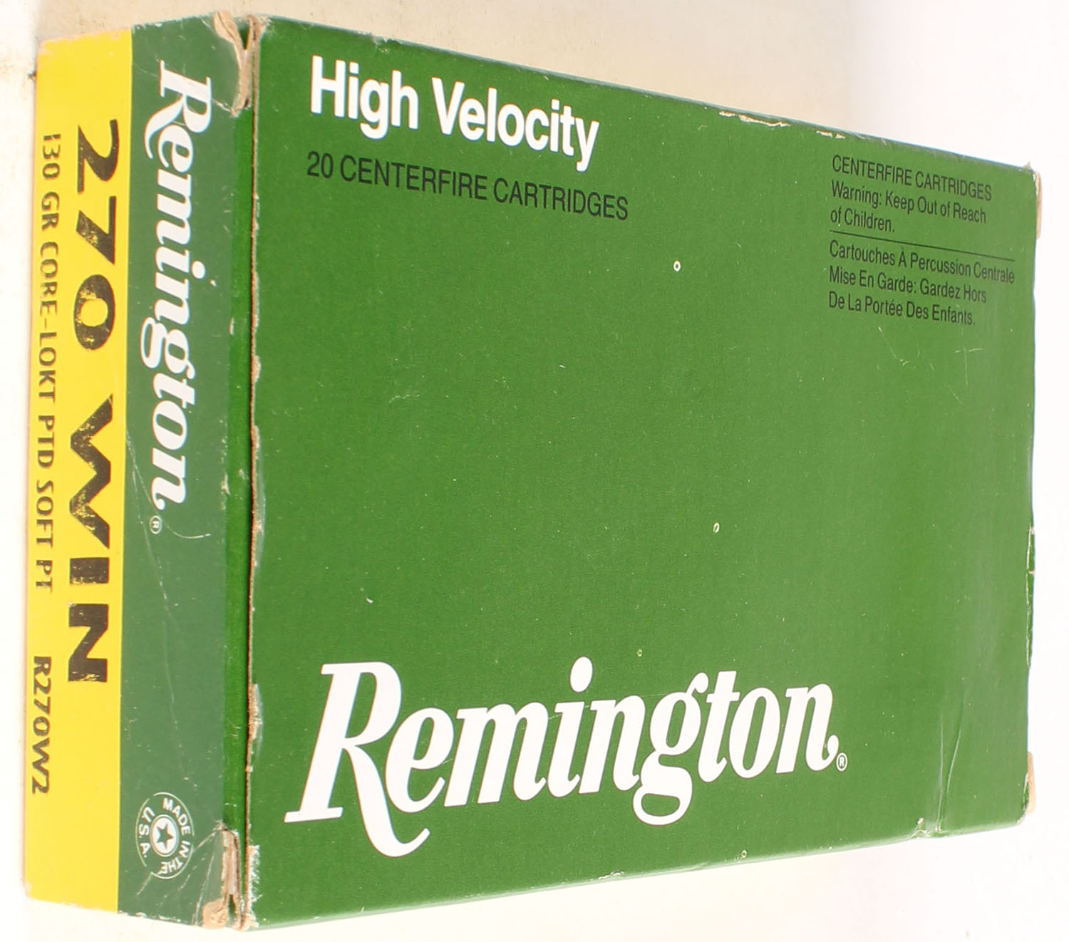 Remington, High Velocity, 270 WIN, 130 Gr. Core-Lokt PTD Soft Point, Full, 1pc. Yellow, green, white & black box, box is solid with very good color, end flaps are solid, ammo is excellent. Grade: Very Good ++ - Value: 20 to 40