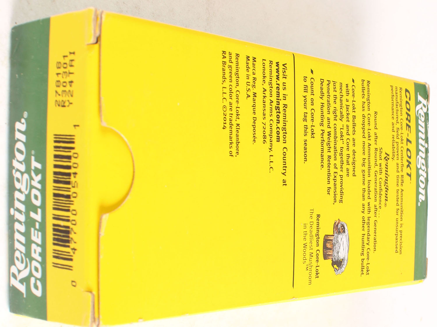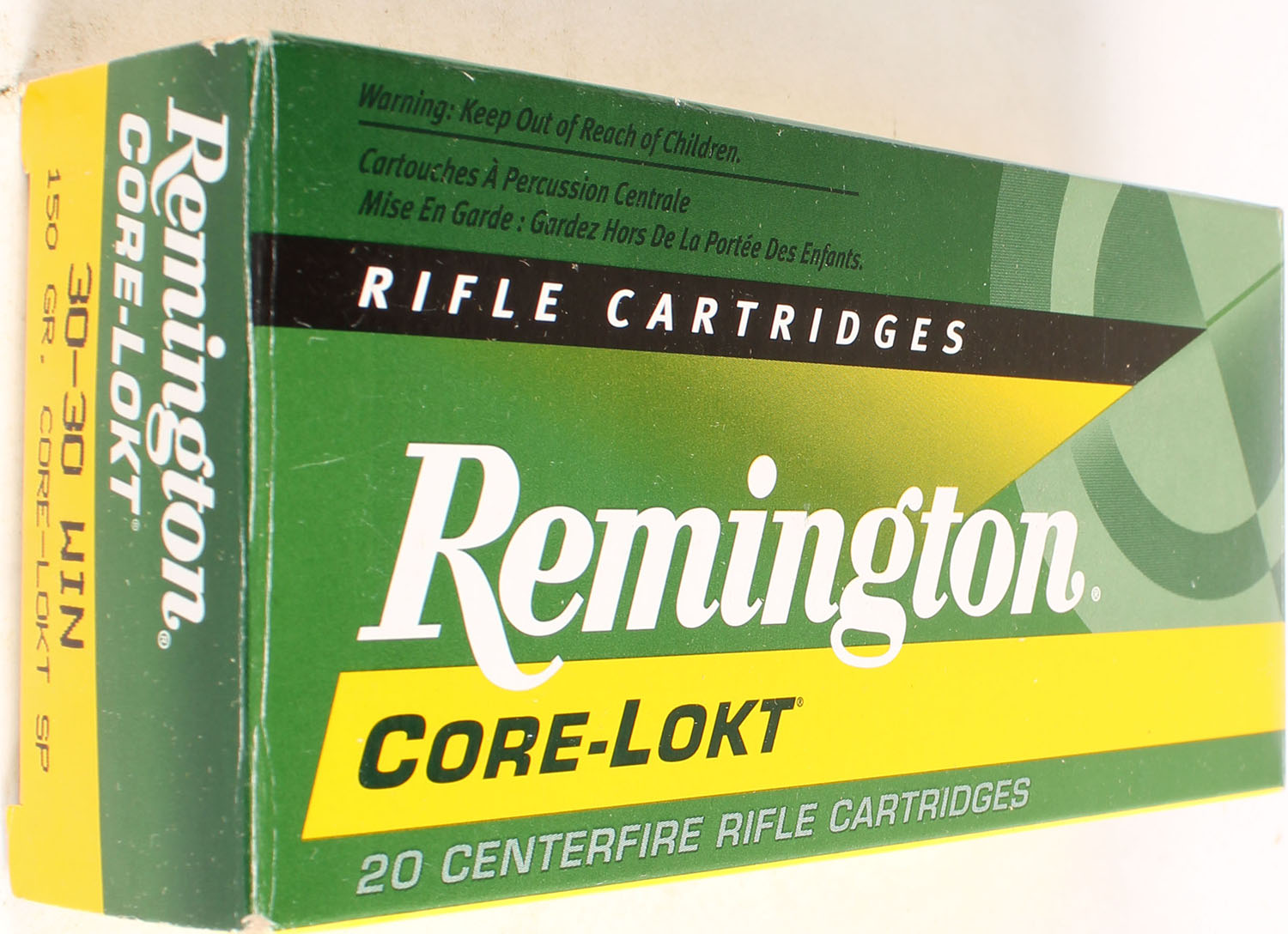 Remington, Core-Lokt, 30-30 WIN, 150 Gr. Soft Point, Full, 1pc. Yellow & green box, box is solid with great color, end flaps are solid, ammo is excellent. Grade: Excellent + - Value: 20 to 60