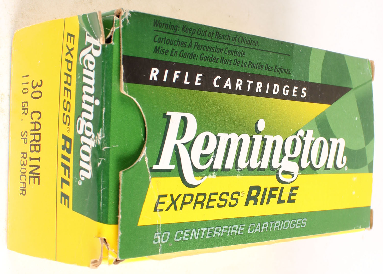 Remington, Express Rifle, 30 Carbine, 110 Gr. S.P, Partial 48rds., 1pc. Yellow, green, white & black box, box is solid with great color, end flaps are solid, ammo is excellent. Grade: Excellent - Value: 20 to 60