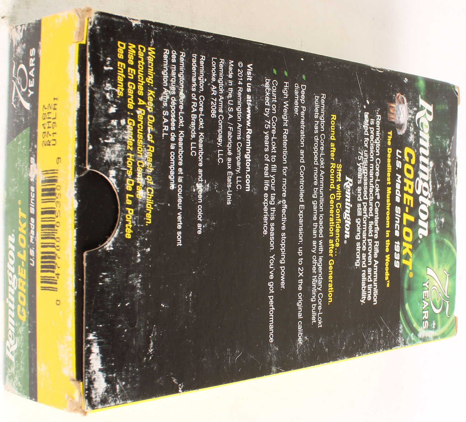 Remington, 75 Years, 7mm Rem. Mag., 150 Gr. Core-Lokt PSP, Full, 1pc. Yellow, green, white & black box, box is solid with rub marks, end flaps are solid, ammo is excellent. Grade: Very Good ++ - Value: 20 to 60