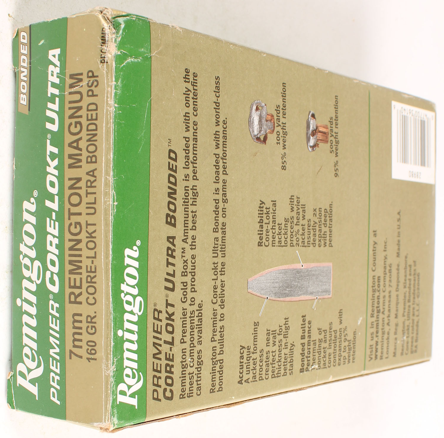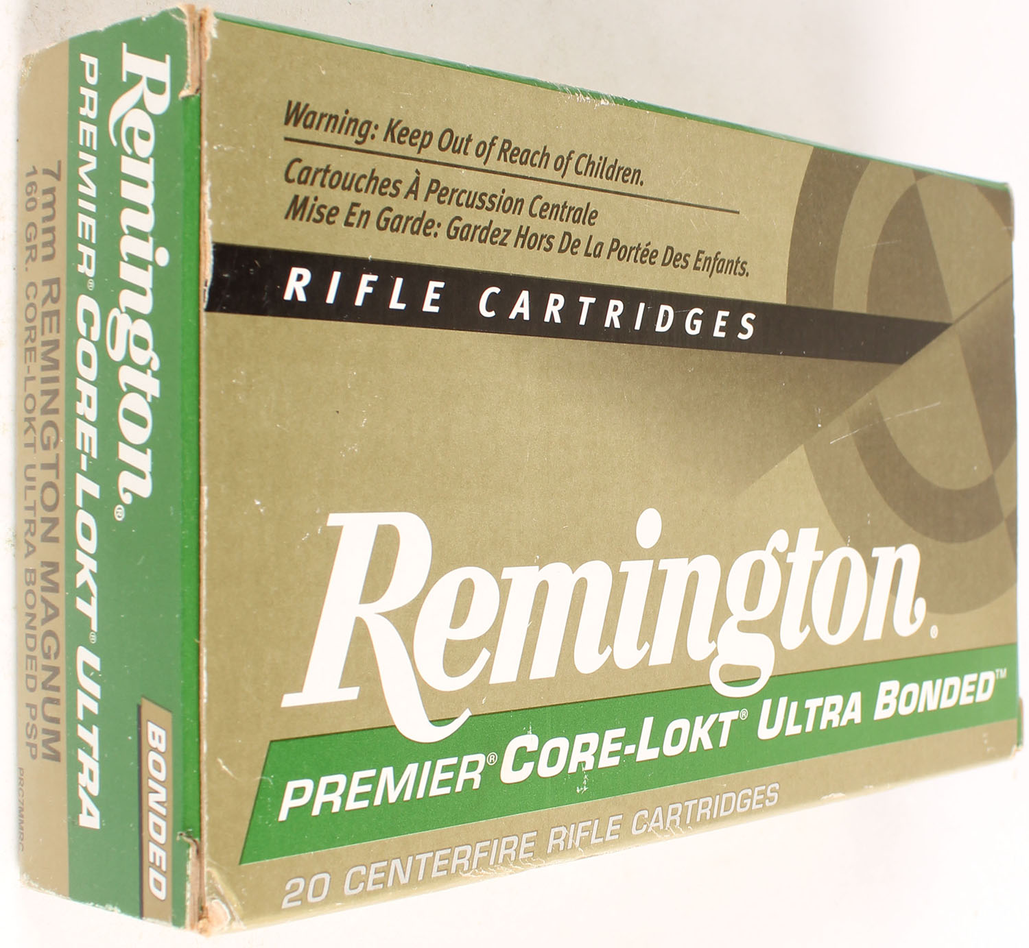Remington, Premier Core-Lokt, 7mm Rem. Mag., 160 Grain PSP, Full, 1pc. Gold, green & white box, box is solid with good color, very minor corner wear, end flaps are solid, ammo is excellent. Grade: Excellent - Value: 20 to 60