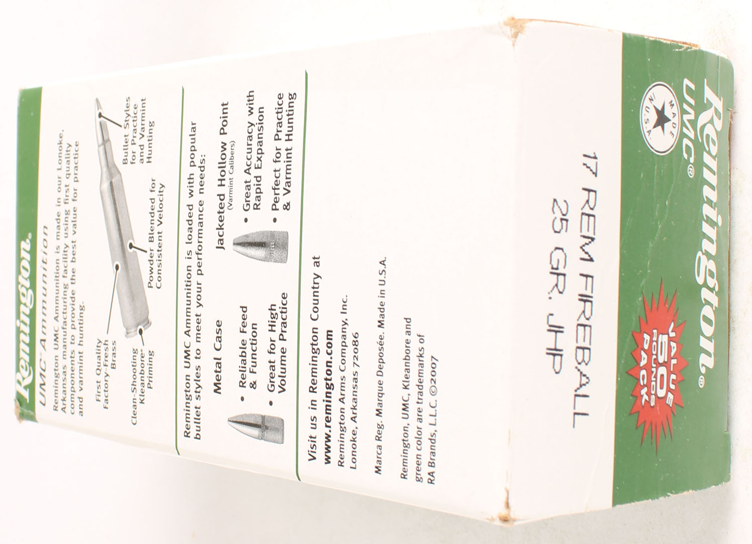 Remington, .17 Remington Fireball, 25 Grain, JHP, Full, 1pc. Green & white box, box is solid with great color, ammo is excellent. Grade: Excellent - Value: 20 to 60