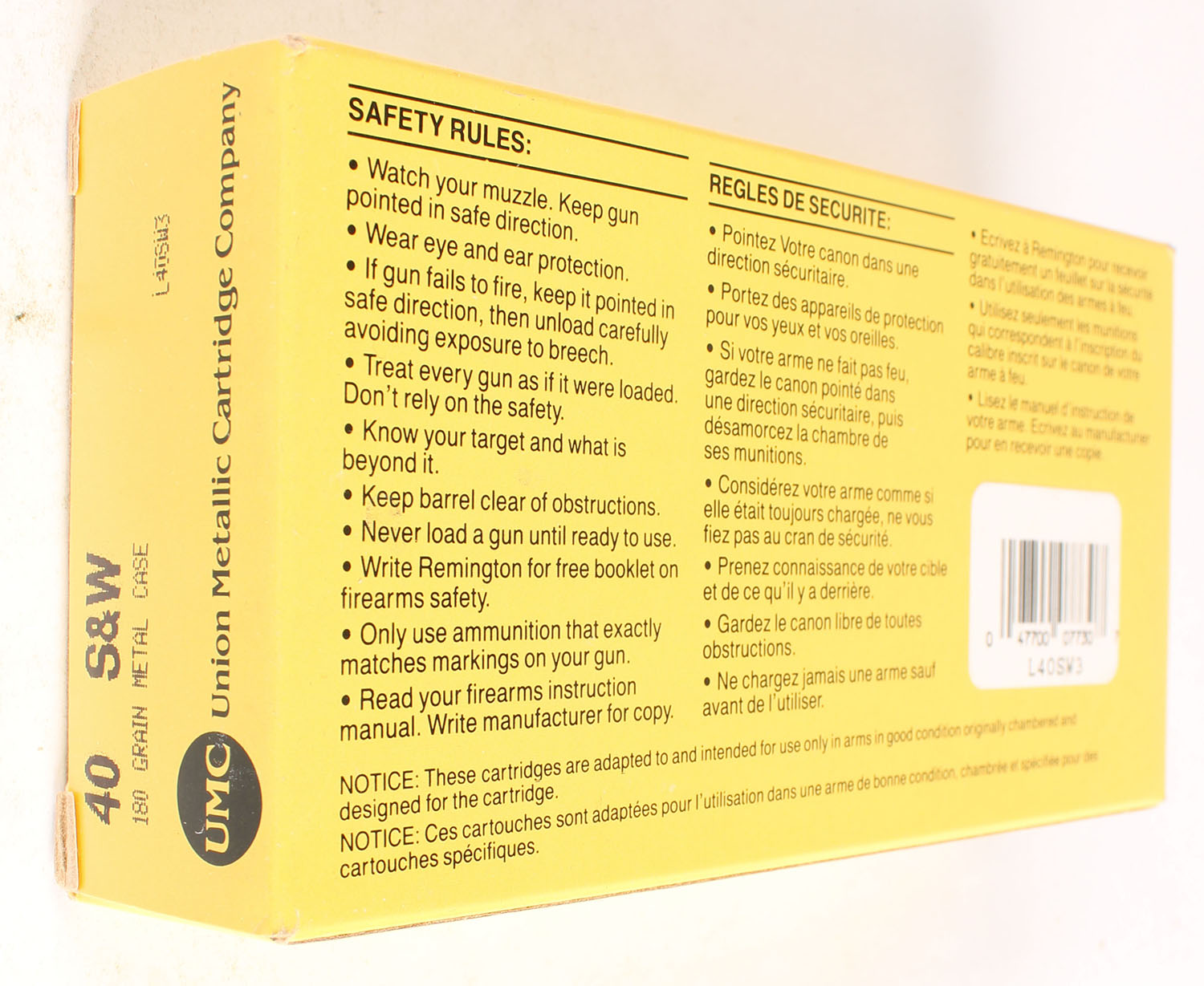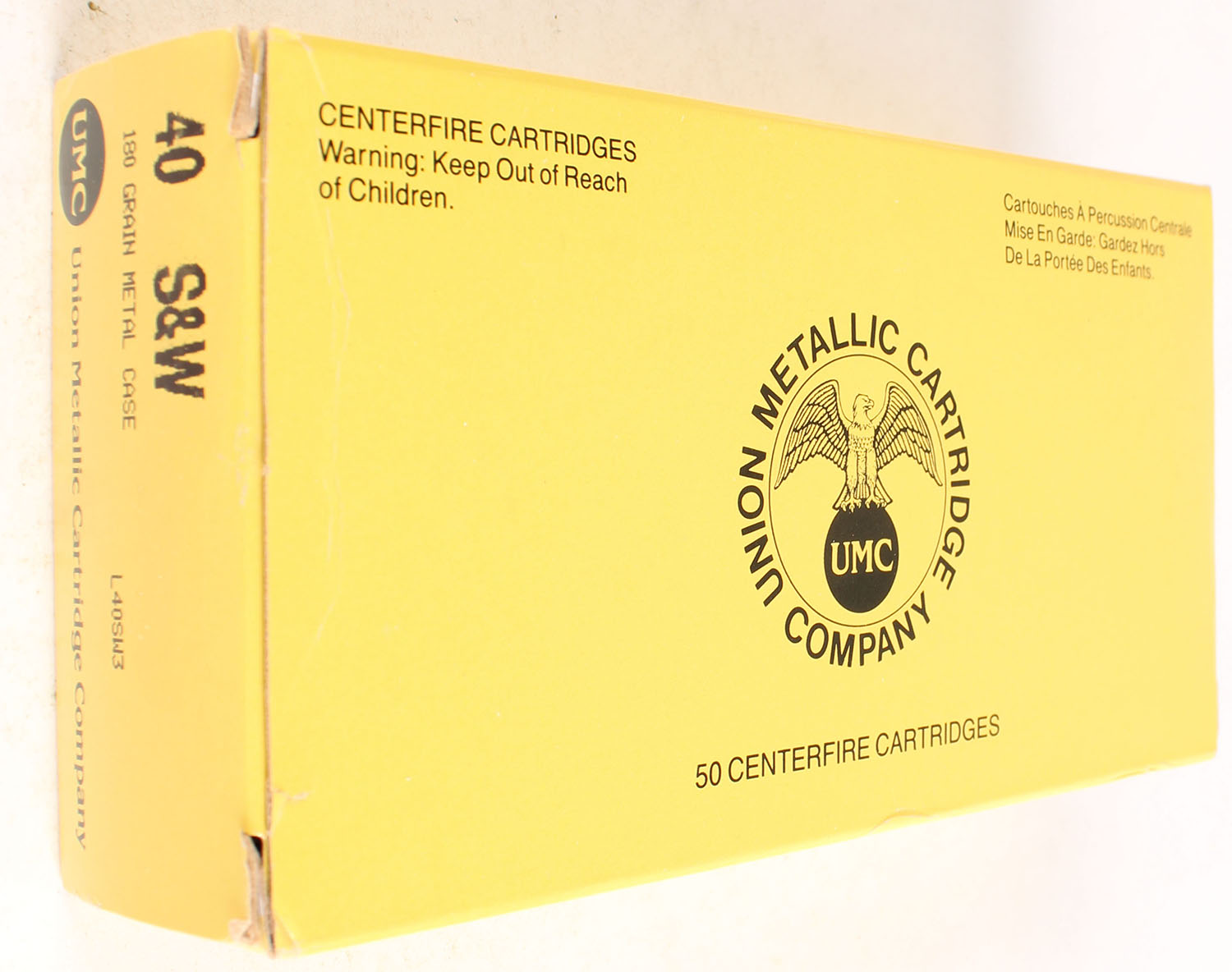 UMC, 40 S&W, 180 Grain Metal Case, Full, 1pc. Yellow box, box is solid with great color, minor edge & corner wear, end flaps are solid, ammo is excellent. Grade: Excellent - Value: 20 to 80