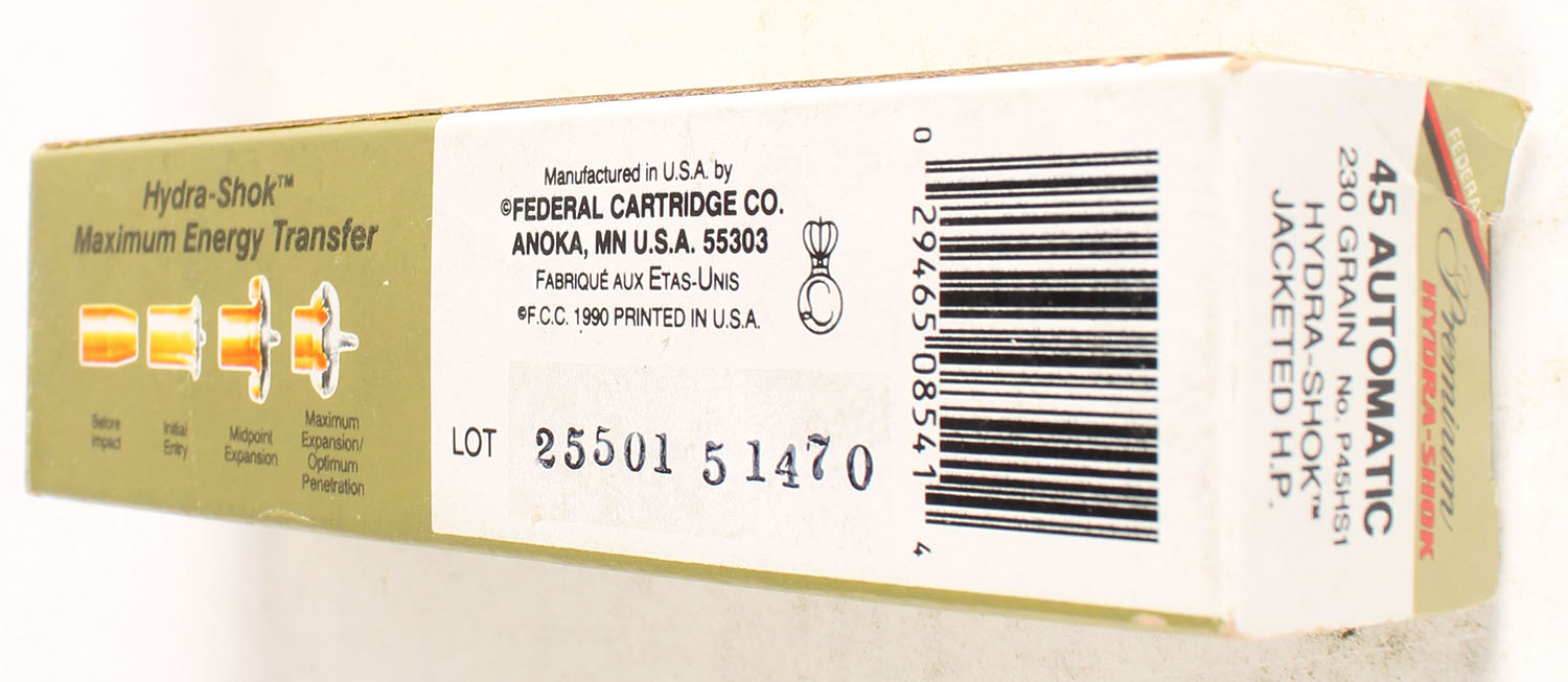 Federal, Premium Hydra-Shok, 45 Auto, 230 Gr. Jacketed H.P., Full, 1pc., multi-colored box, box is solid with great color, end flaps are solid, ammo is excellent. Grade: Excellent - Value: 16 to 40