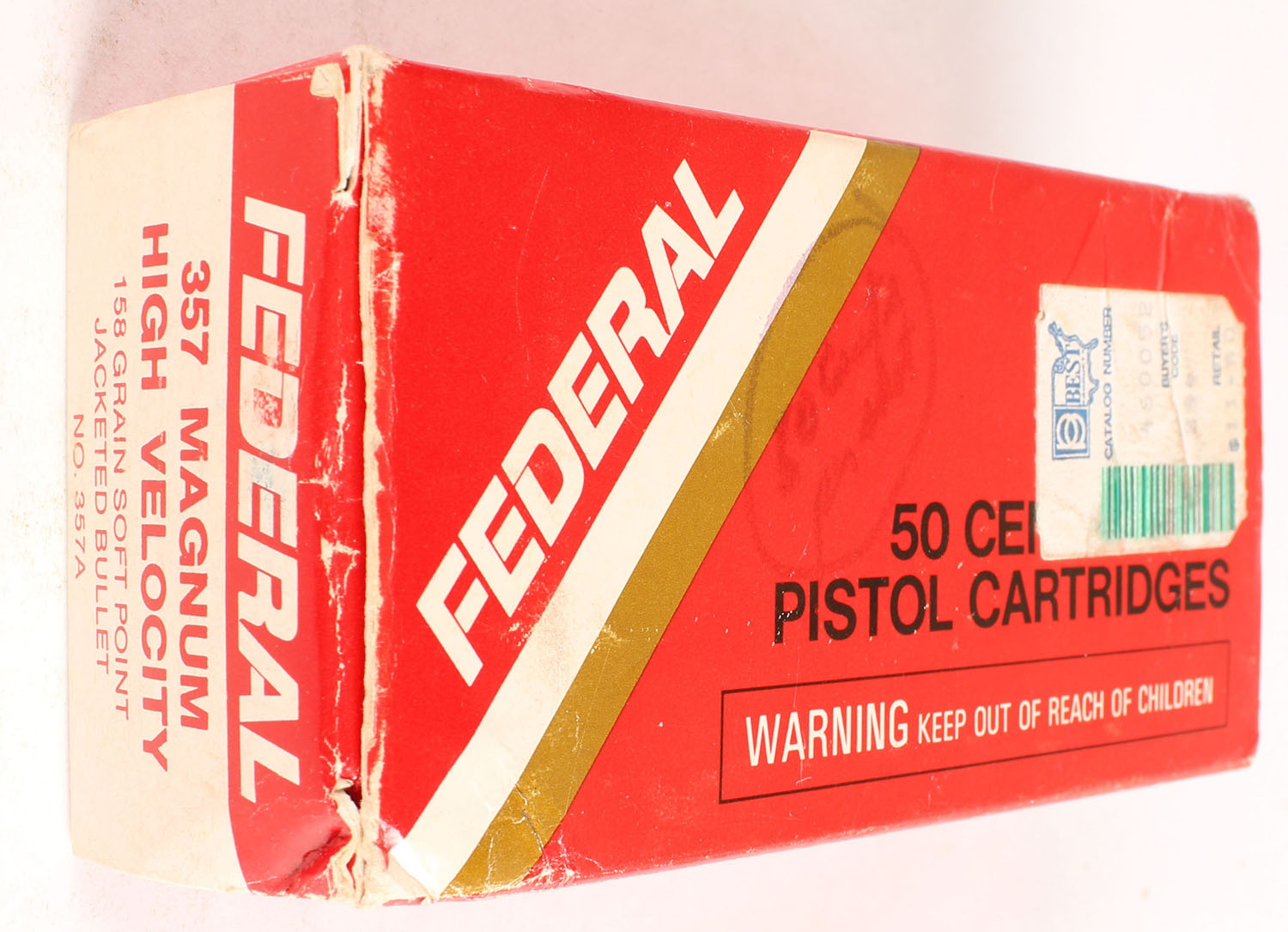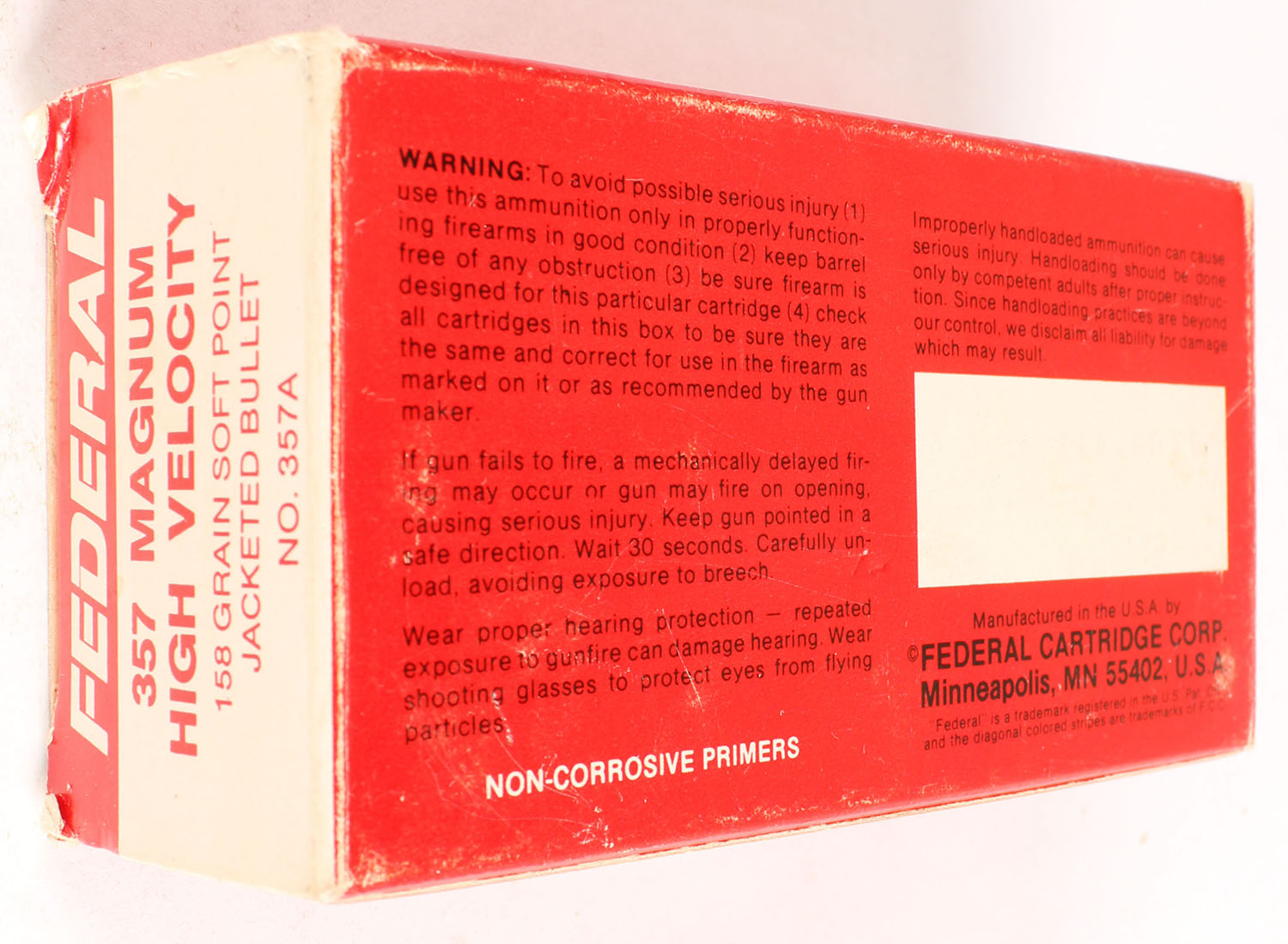 Federal, .357 Magnum High Velocity, 158 Gr. Soft Point Jacketed Bullet, 1pc, Partial 45rds., red box with white/gold label & white/black print, box has handling wear with some corner wear, has sticker to front, ammo is excellent. Grade: Very Good - Value: 20 to 60