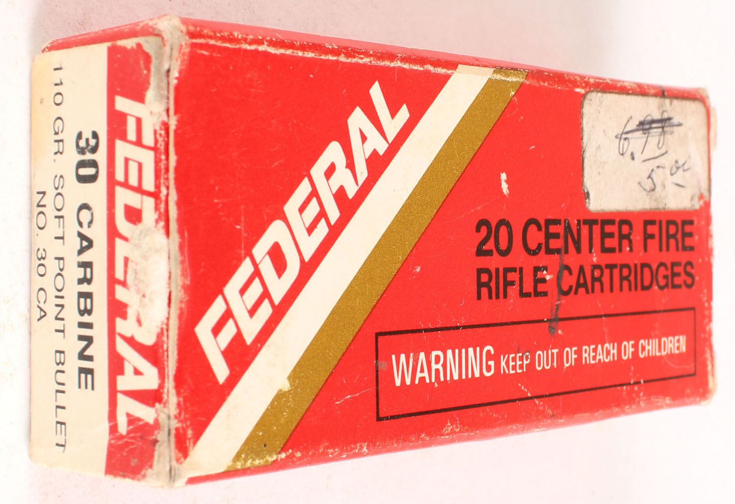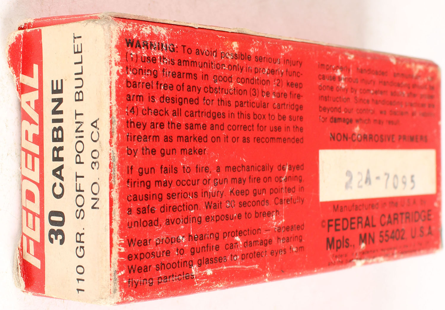 Federal, .30 Carbine, 110 Gr. Soft Point, Full, 1pc. Red white & gold box, box has scuffing with edge & corner wear, end flaps are solid, ammo is very good. Grade: Very Good - Value: 10 to 50