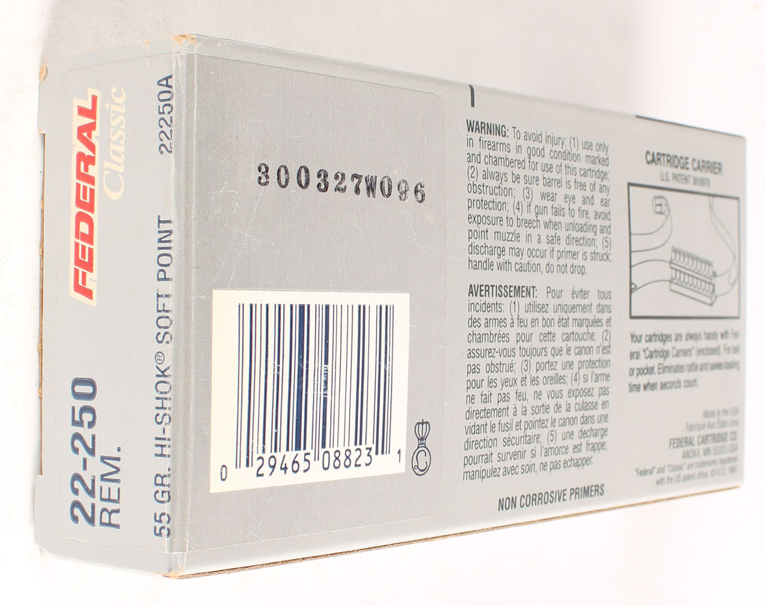 Federal, Classic, 22-250 Rem., 55 Gr. Hi-Shok Soft Point, Full, 1pc. Multi-colored box, box is solid with great color, end flaps are solid, ammo is minty. Grade: Excellent ++ - Value: 20 to 60