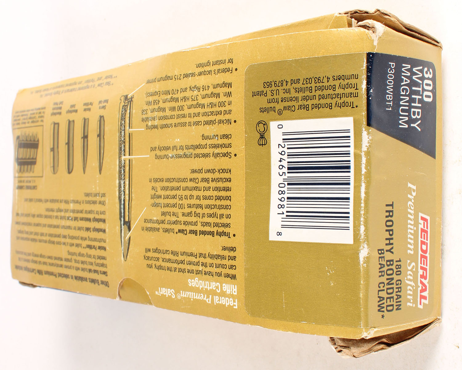 Federal Premium Safari, 300 WTHBY Magnum, 180 Gr. Trophy Bonded Bear Claw, Partial 12rds., 1pc. multi-colored box, box shows wear, ammo is excellent. Grade: Very Good - Value: 10 to 40