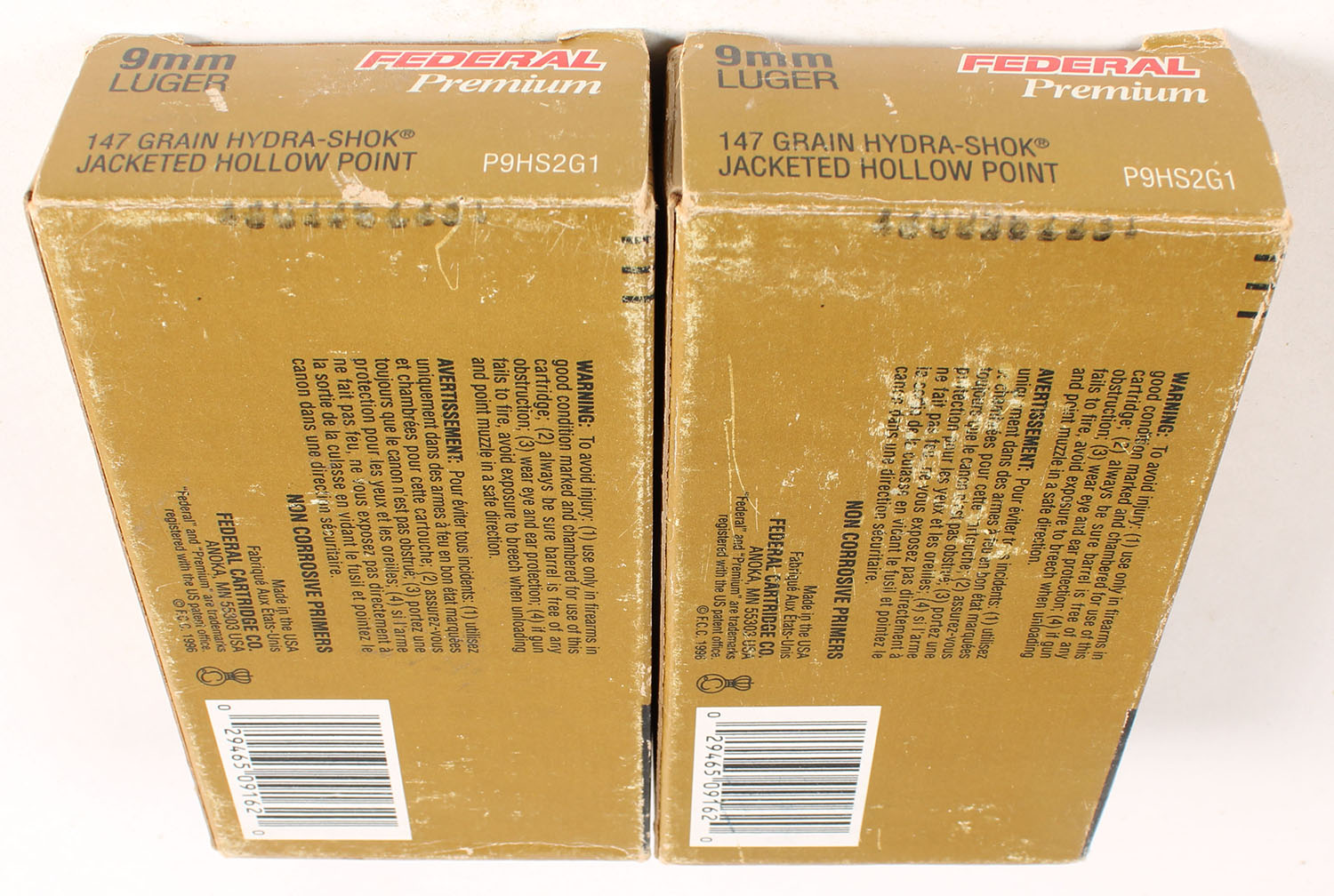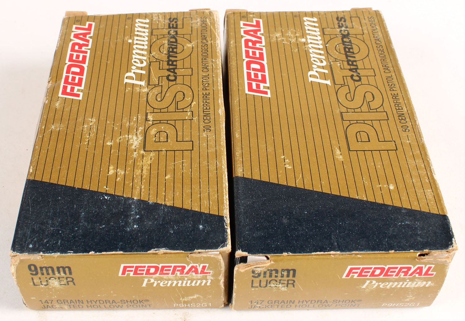 Federal, Lot of (2), Premium, 9mm Luger, 147 Grain Hydra Shok JHP, Full, 1pc., multi-colored box, box is solid with very good color, shelf wear, ammo is excellent. Grade: Very Good ++ - Value: 30 to 60