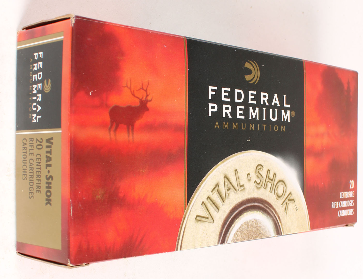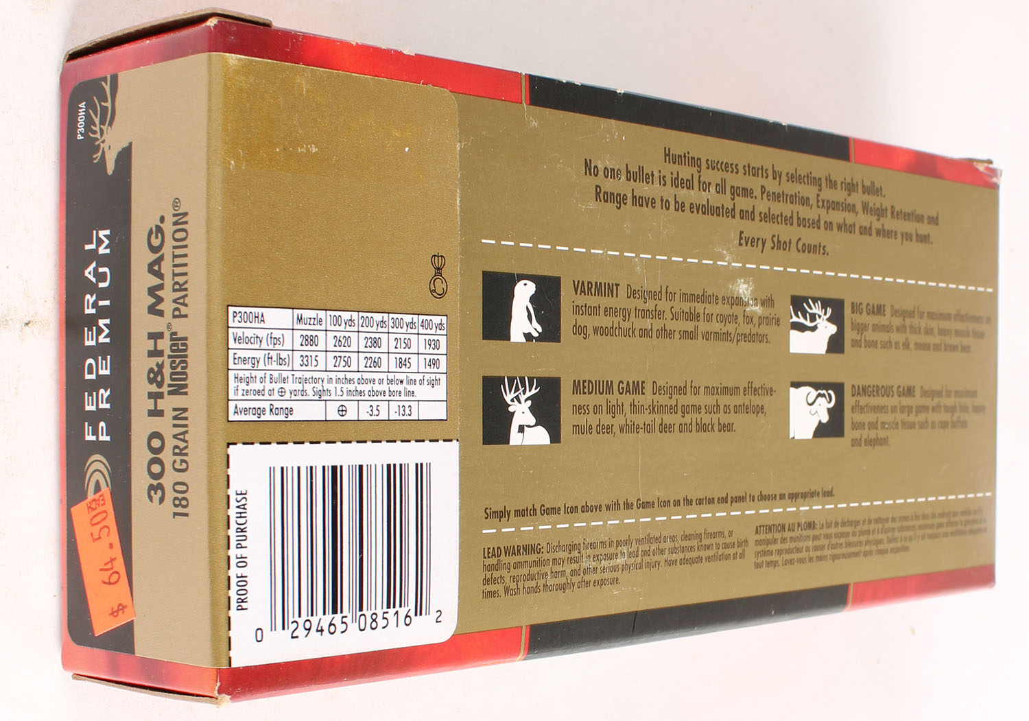 Federal, Vital-Shok, 300 H&H Mag, 180 Grain Nosler Partition, Full, 1pc. Multi-colored box, box is solid with great color, end flaps are solid, ammo is excellent. Grade: Excellent ++ - Value: 20 to 80