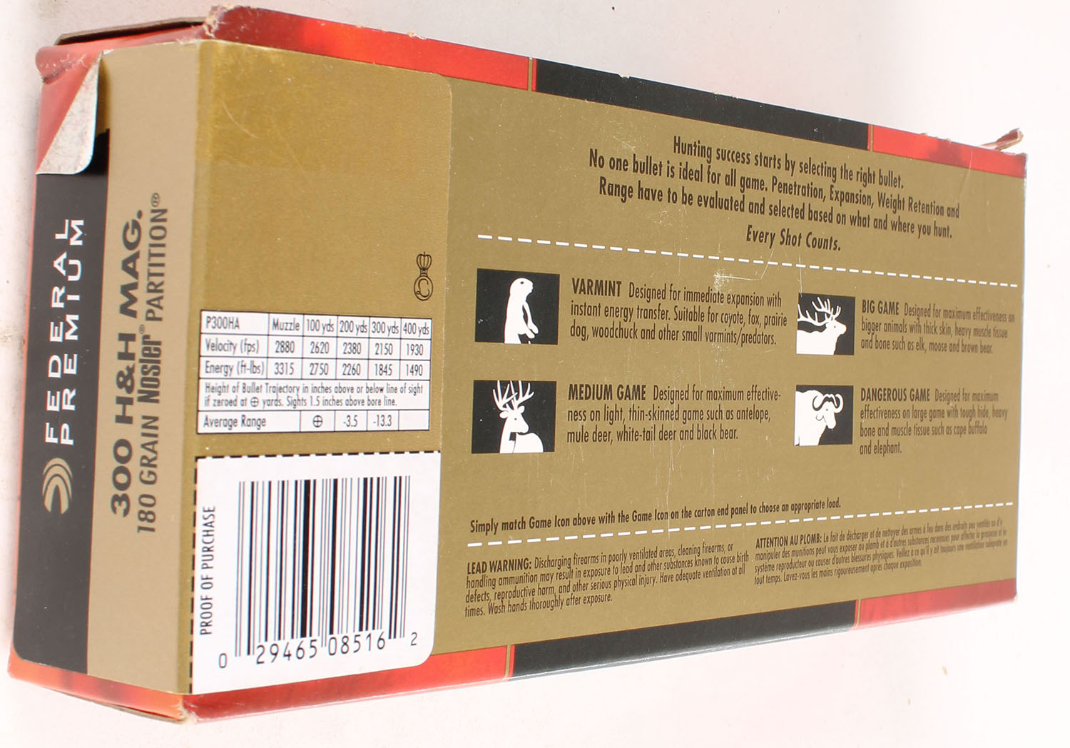 Federal, Vital-Shok, 300 H&H Mag, 180 Grain Nosler Partition, Full, 1pc. Multi-colored box, box is solid with great color, has a seam split, end flaps are solid, ammo is excellent. Grade: Excellent - Value: 20 to 80