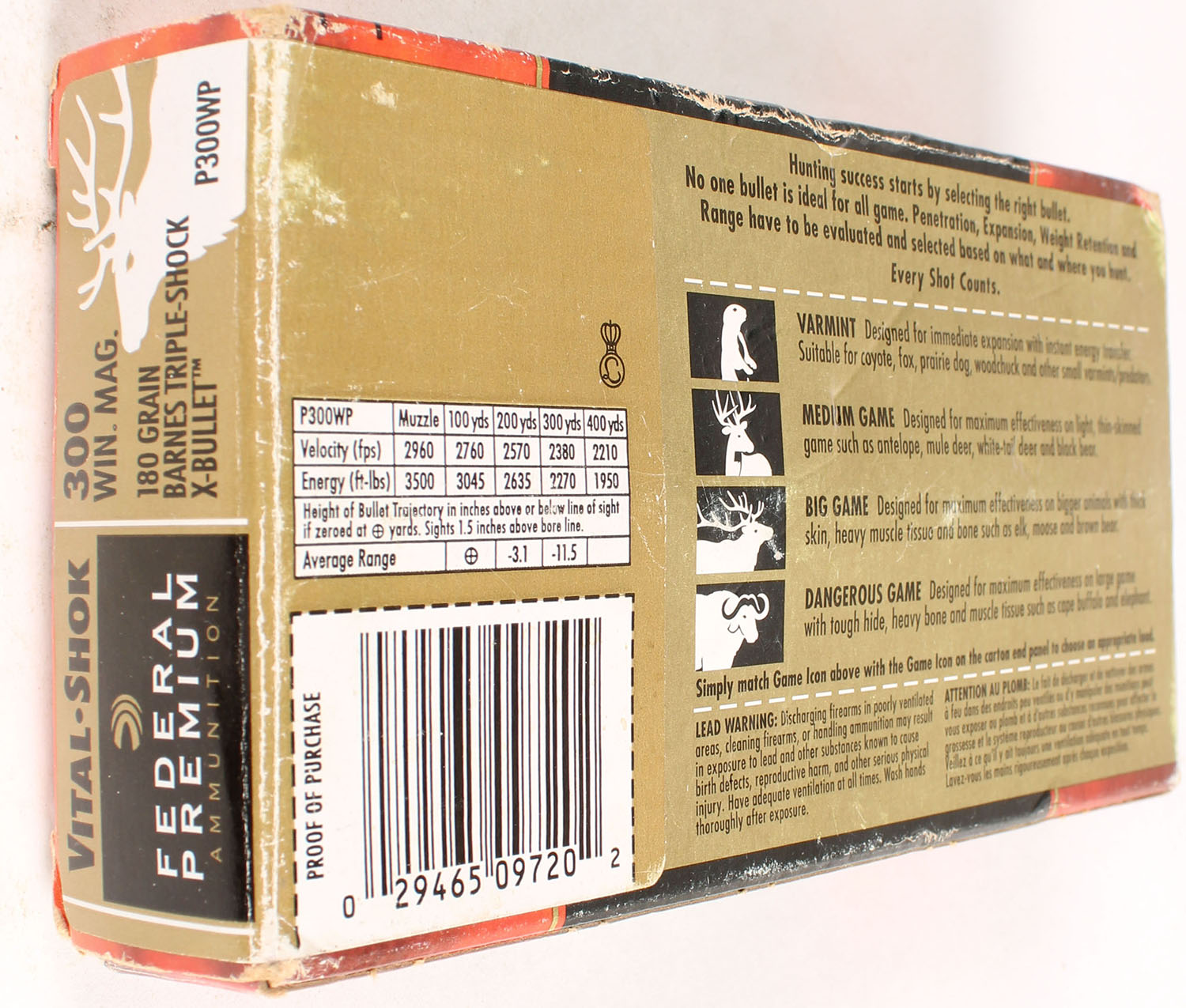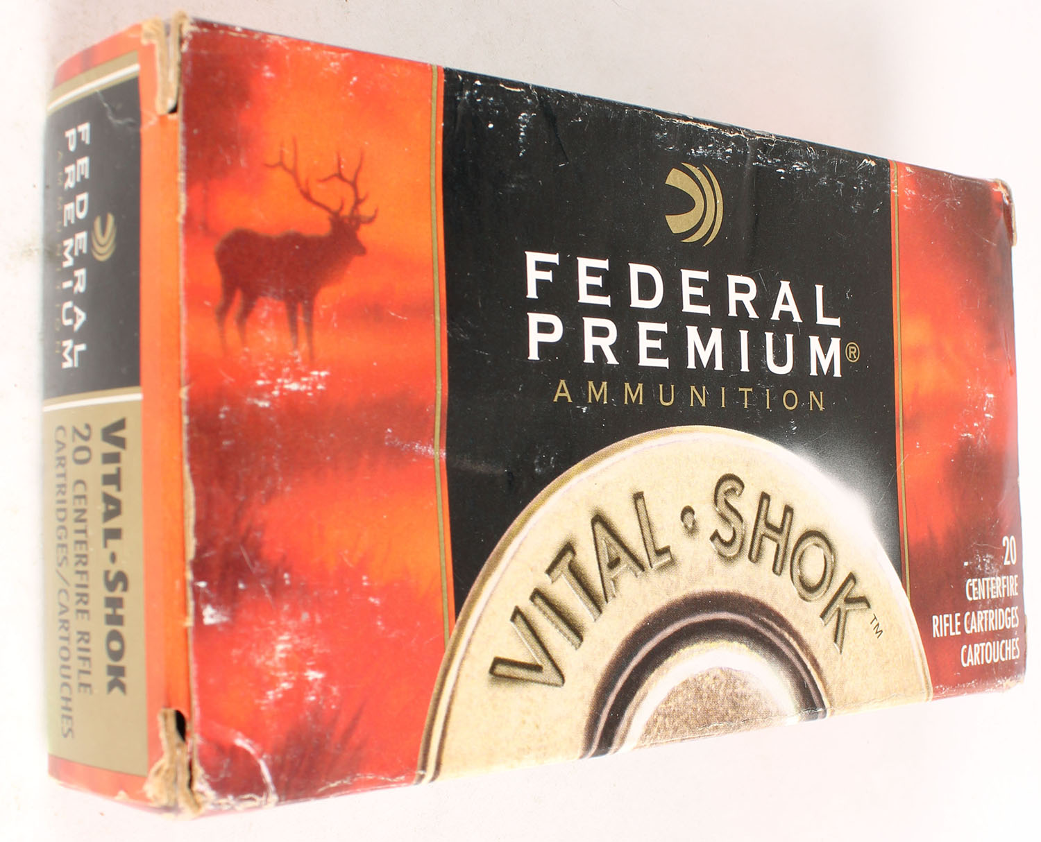 Federal, Vital-Shok, 300 WIN. Mag., 180 Grain Barnes Triple-Shock X-Bullet, Partial 19rds., 1pc., multi-colored box, box has scuffing with great color, end flaps are solid, ammo is very good. Grade: Very Good ++ - Value: 10 to 40