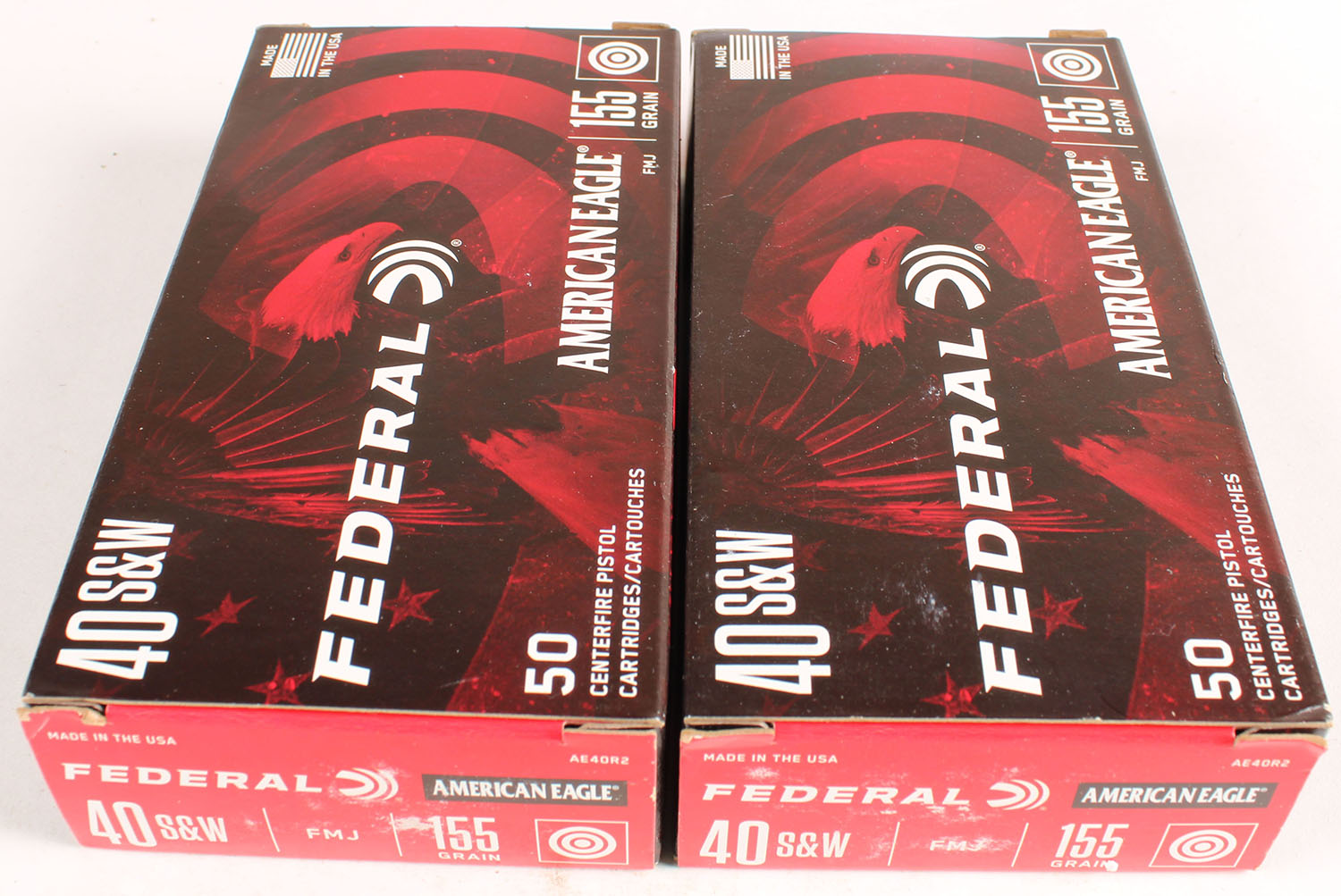 Lot of (2) Federal, American Eagle, 40 S&W, 155 Grain FMJ, Full, 1pc., multi-colored box, boxes are solid with great color, end flaps are solid, ammo is excellent. Grade: Excellent + - Value: 20 to 60