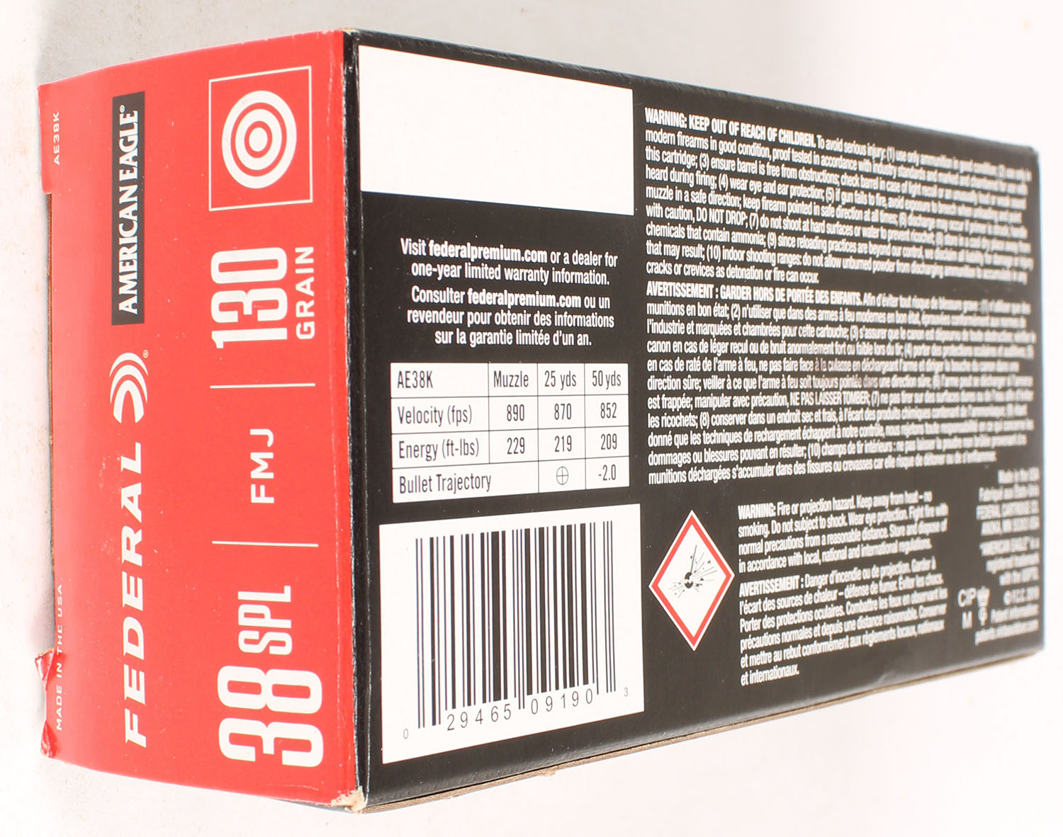 Federal, American Eagle, 38 SPL, 130 Grain FMJ, Full, 1pc., multi-colored box, box is solid with great color, end flaps are solid, ammo is excellent. Grade: Excellent ++ - Value: 10 to 50