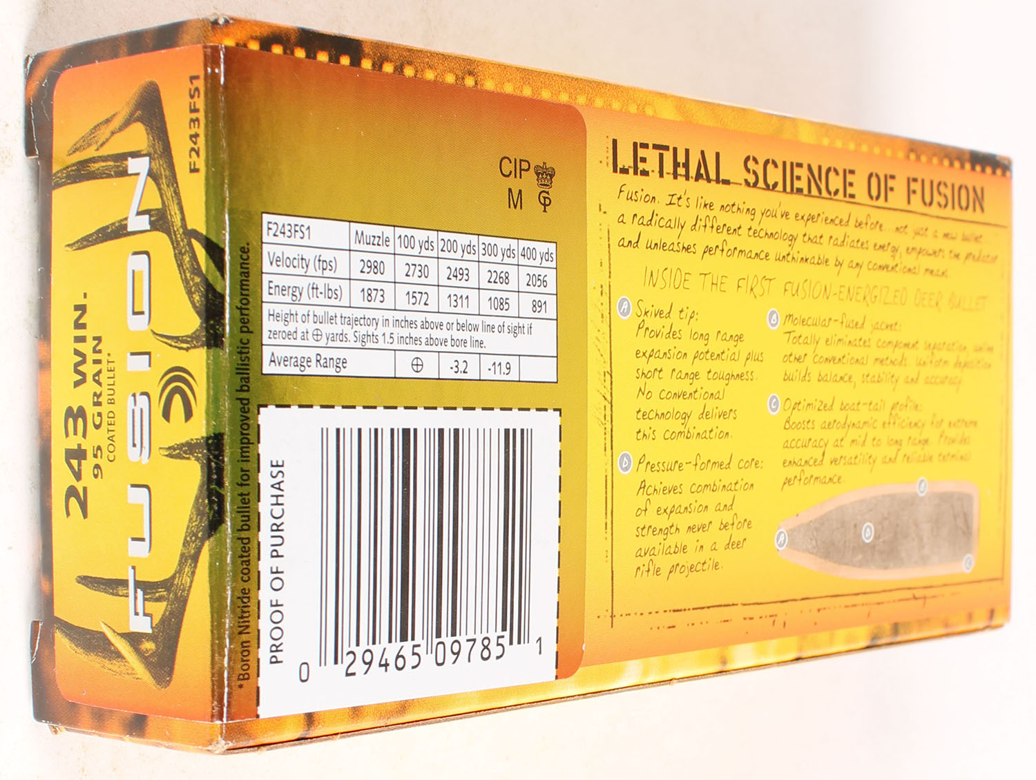 Federal Fusion, 243 WIN., 95 Grain, Full, 1pc. multi-colored box, box is solid with excellent color, Ammo is excellent. Grade: Excellent ++ - Value: 20 to 80