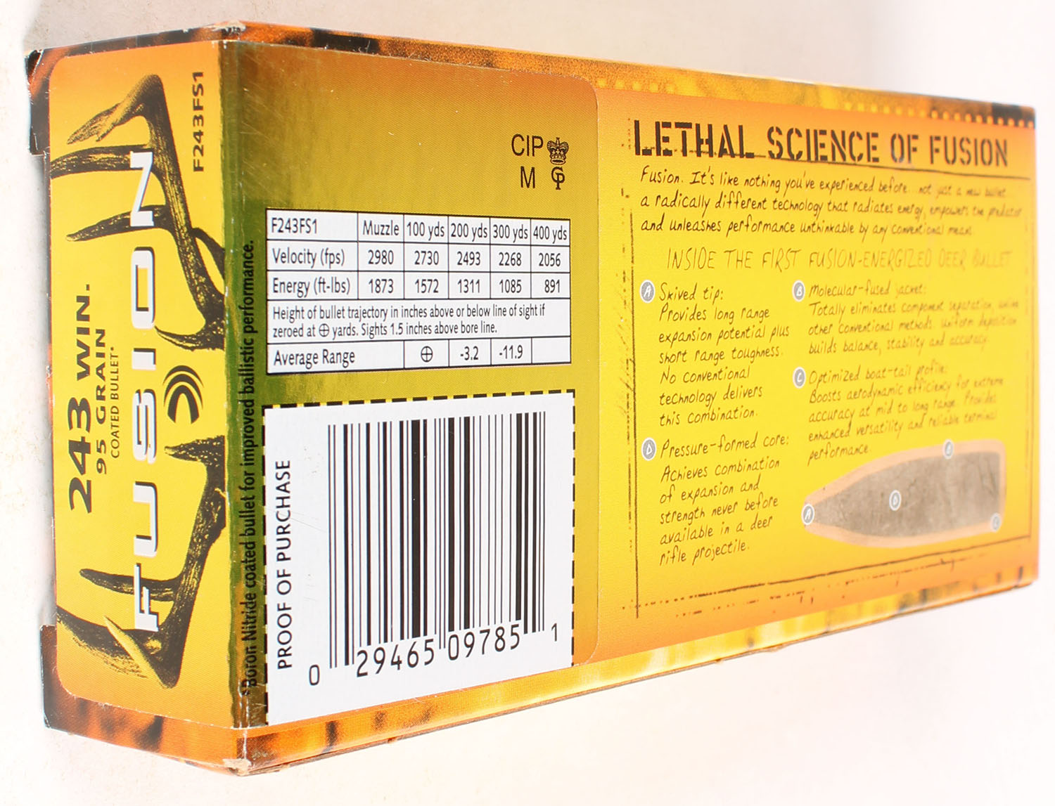 Federal Fusion, 243 WIN., 95 Grain, Full, 1pc. multi-colored box, box is solid with excellent color, Ammo is excellent. Grade: Excellent ++ - Value: 20 to 80
