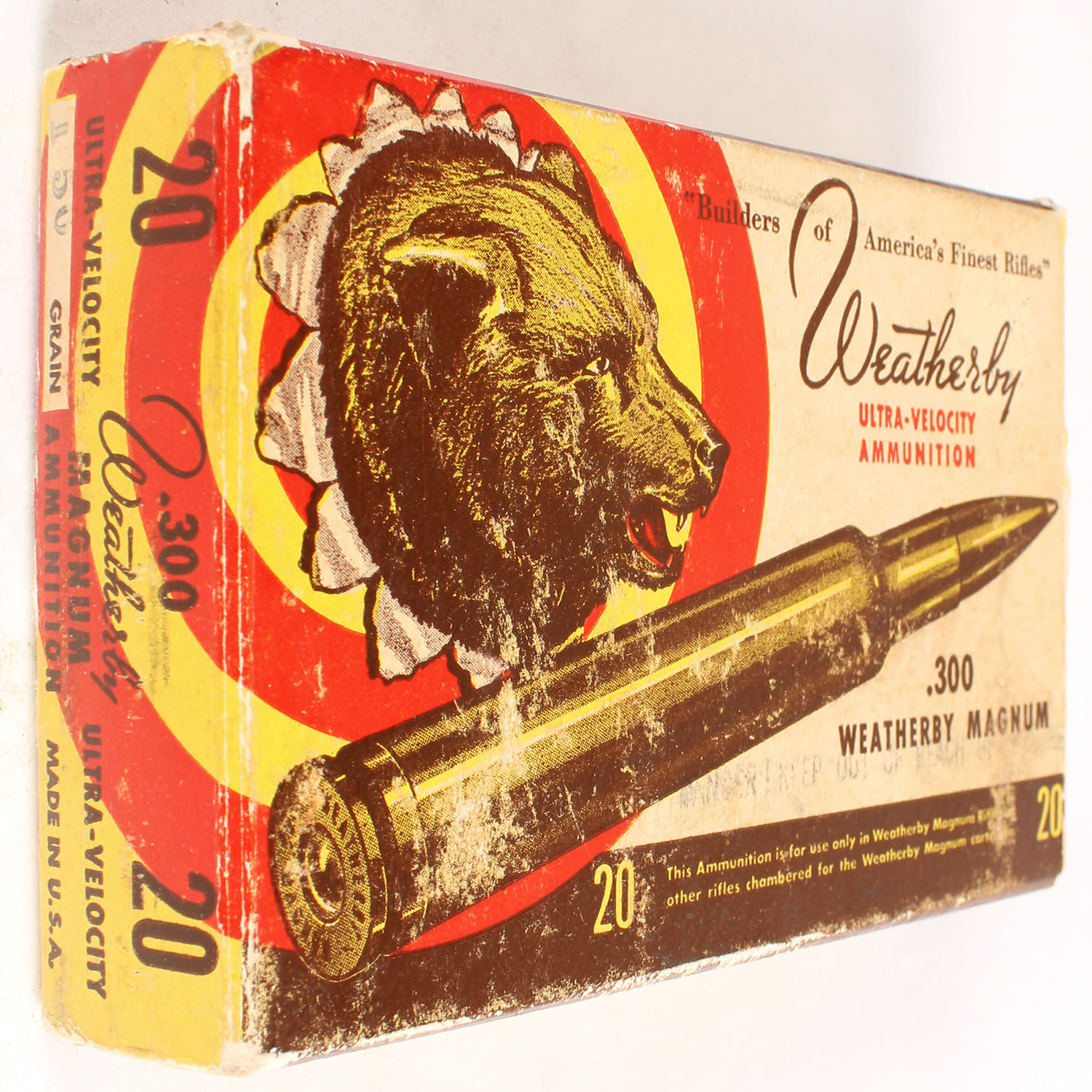 Weatherby, 300 W.M., 150 Grain Ultra-Velocity, Full, 1pc. multi-colored box, box has minor age soiling & corner wear, Ammo is very good. Grade: Very Good ++ - Value: 20 to 80
